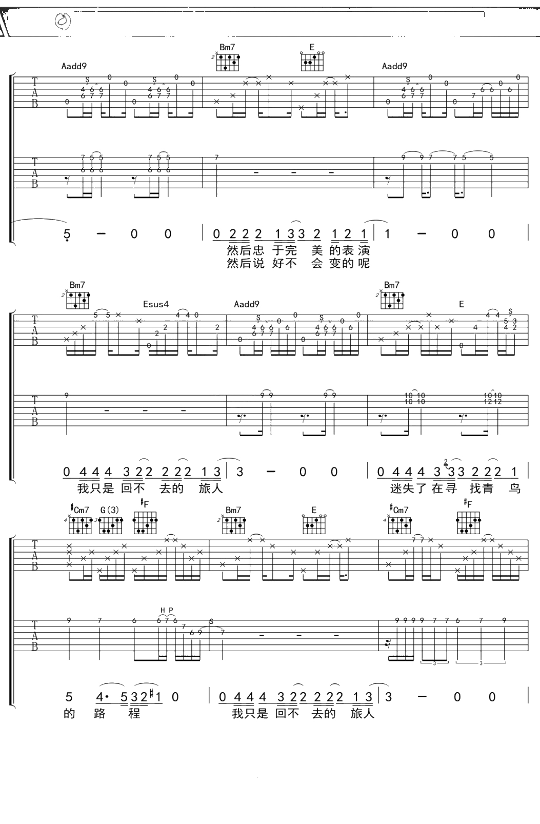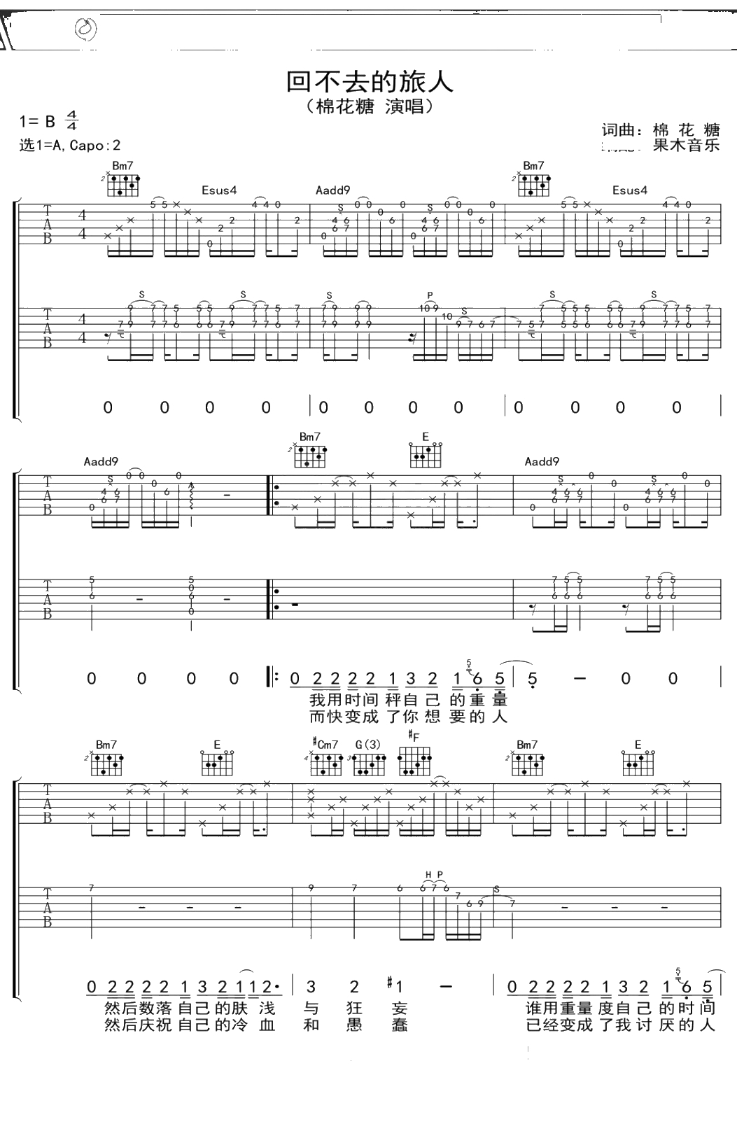 棉花糖《回不去的旅人》吉他谱 A调弹唱六线谱