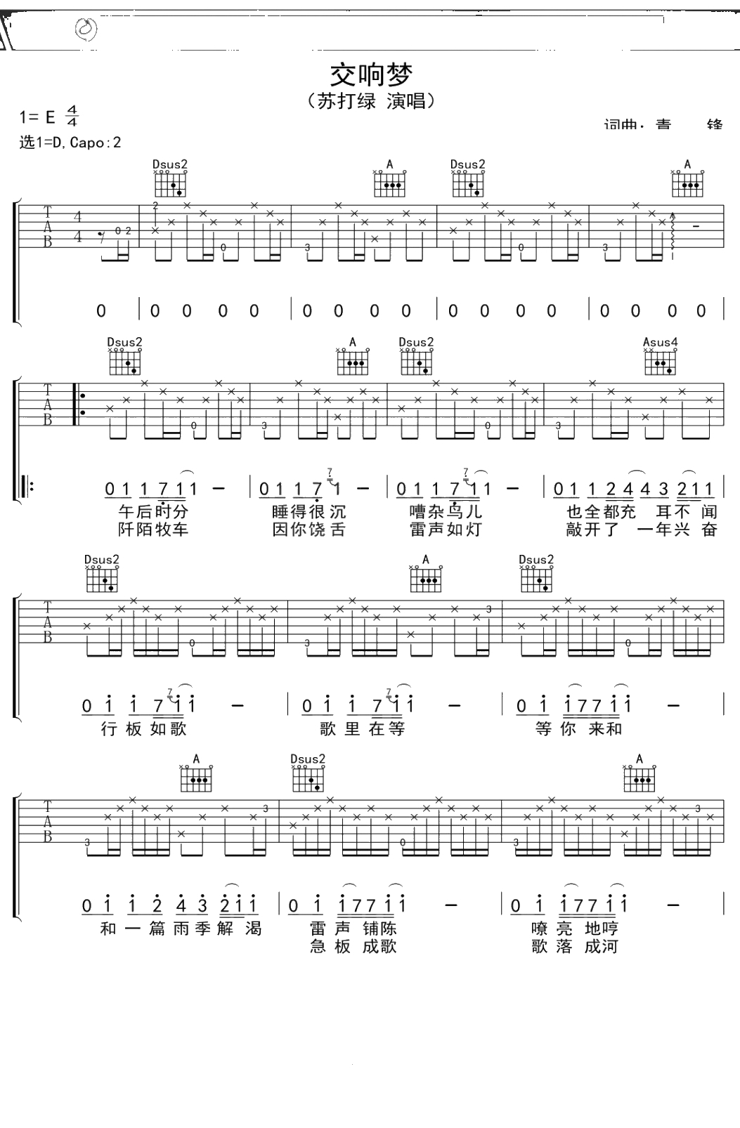 苏打绿《交响梦》吉他谱 D调弹唱六线谱吉他谱