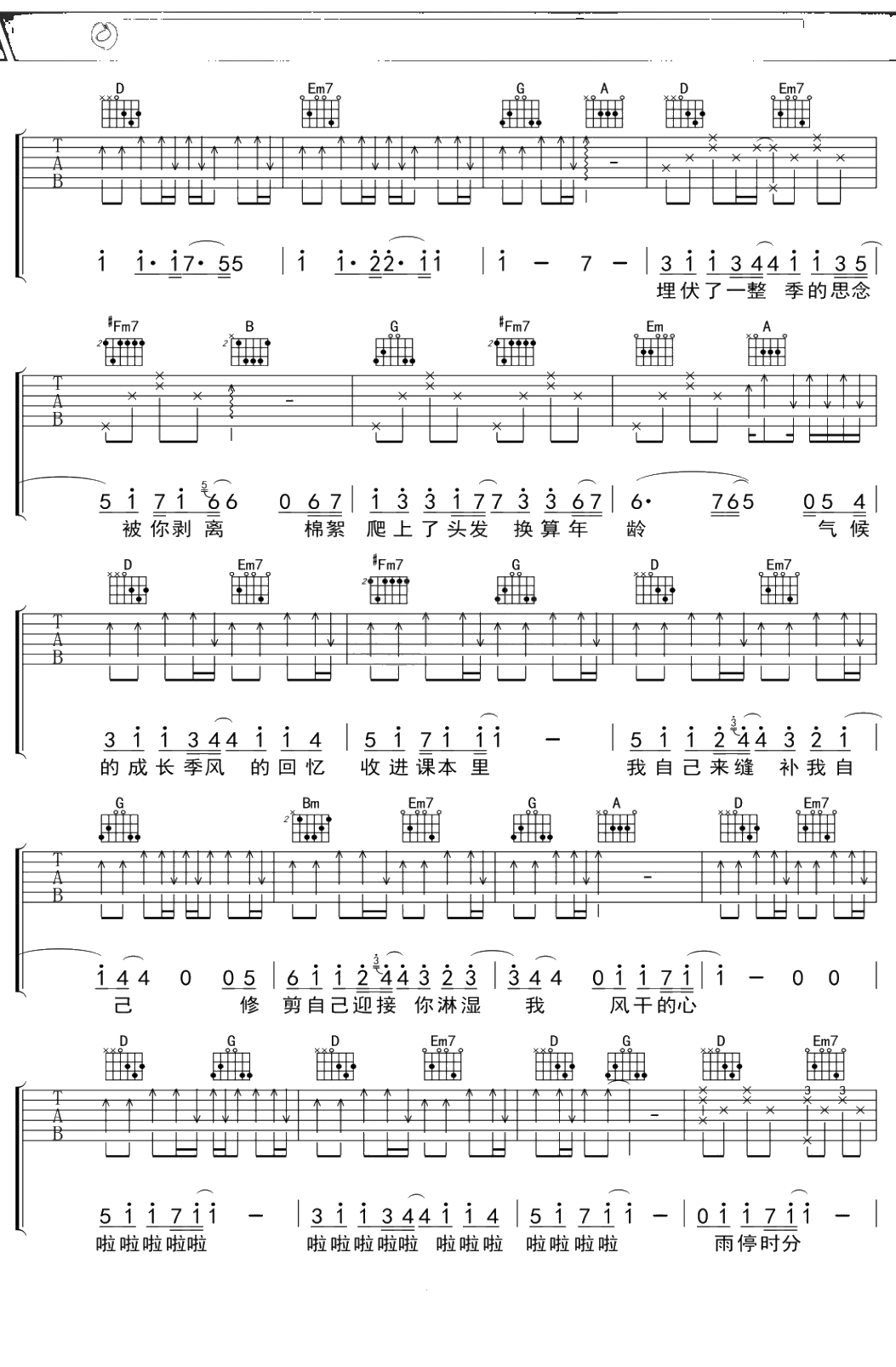 苏打绿《交响梦》吉他谱 D调弹唱六线谱