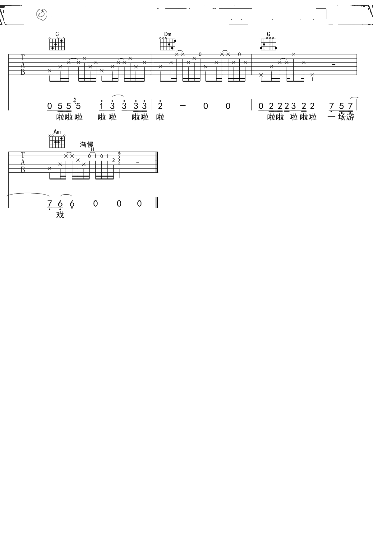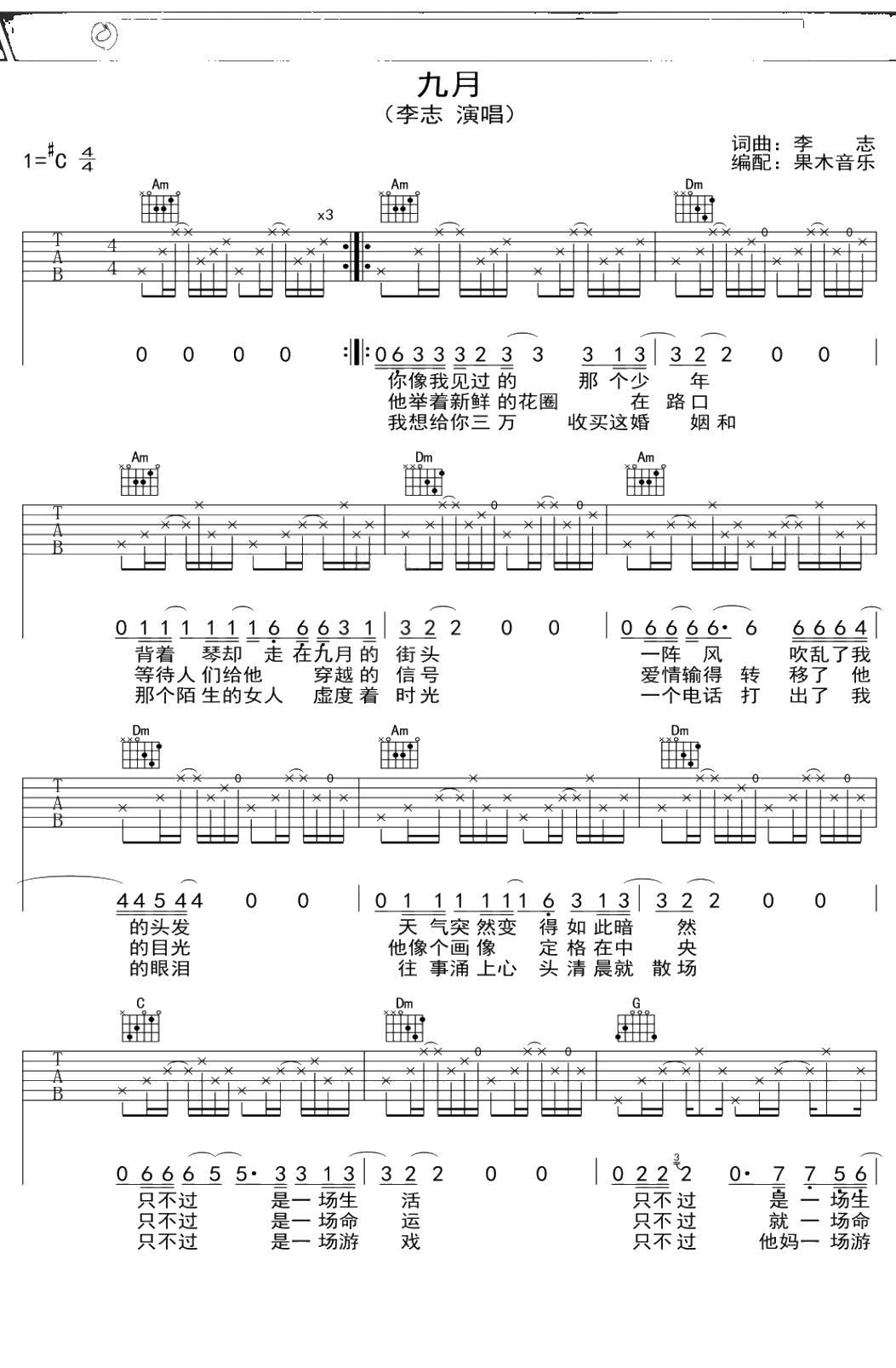李志《九月》吉他谱 C调弹唱六线谱吉他谱