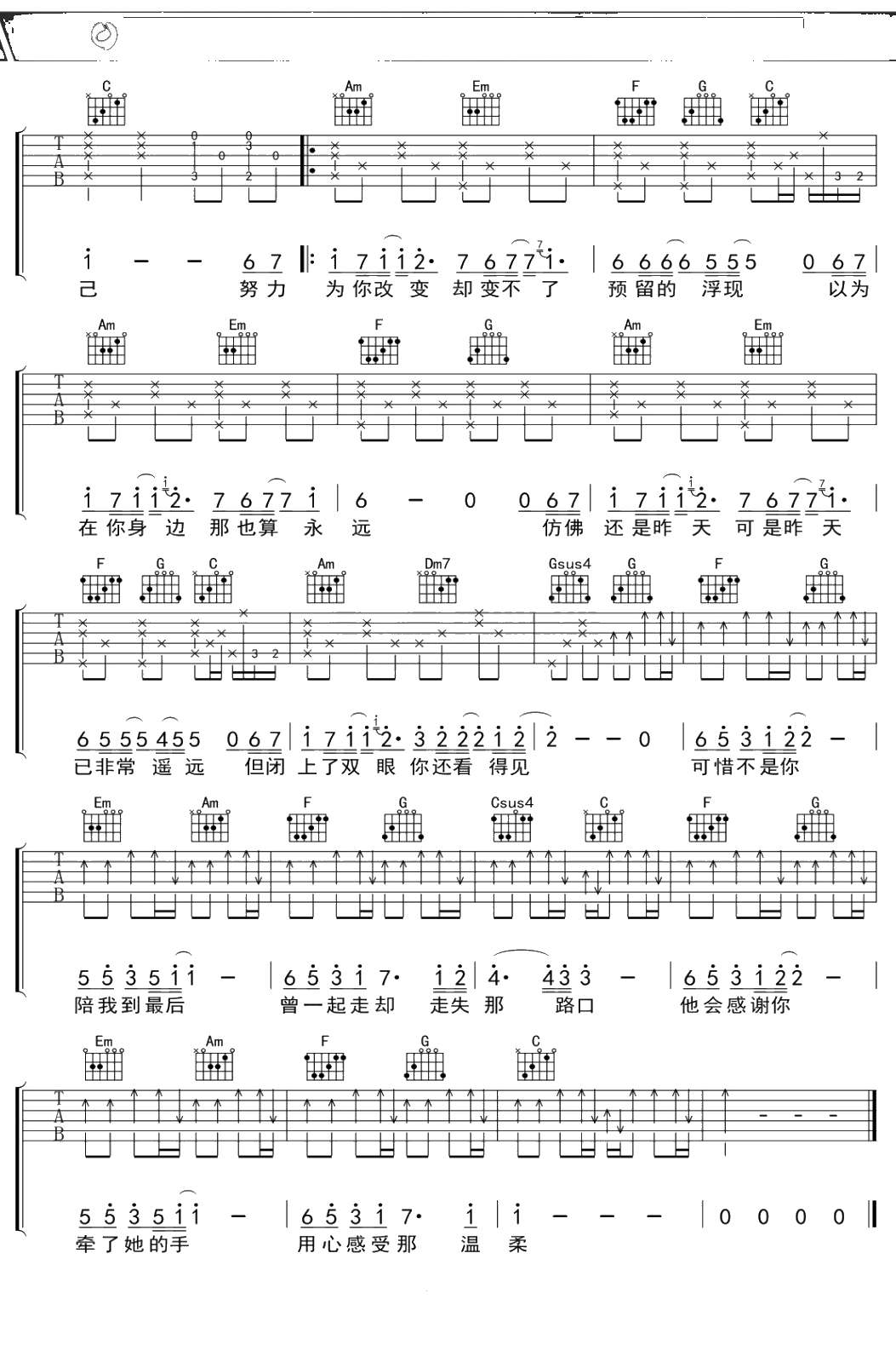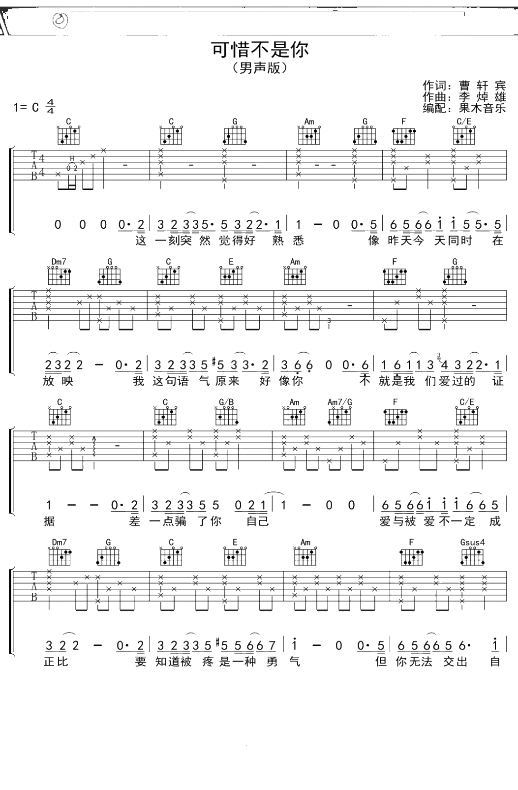 《可惜不是你》吉他谱 男生版 C调弹唱六线谱吉他谱