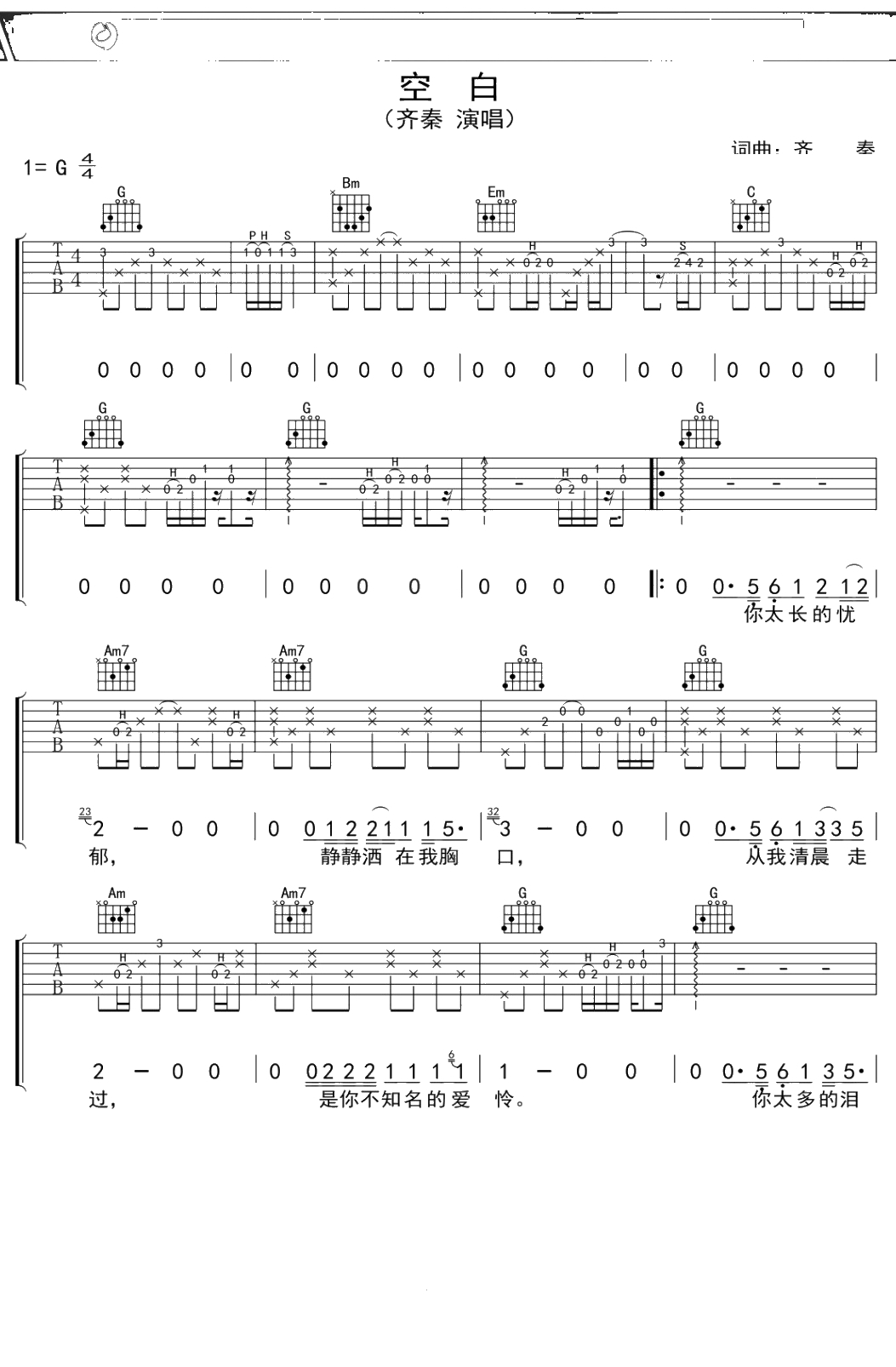 齐秦《空白》吉他谱 G调弹唱六线谱