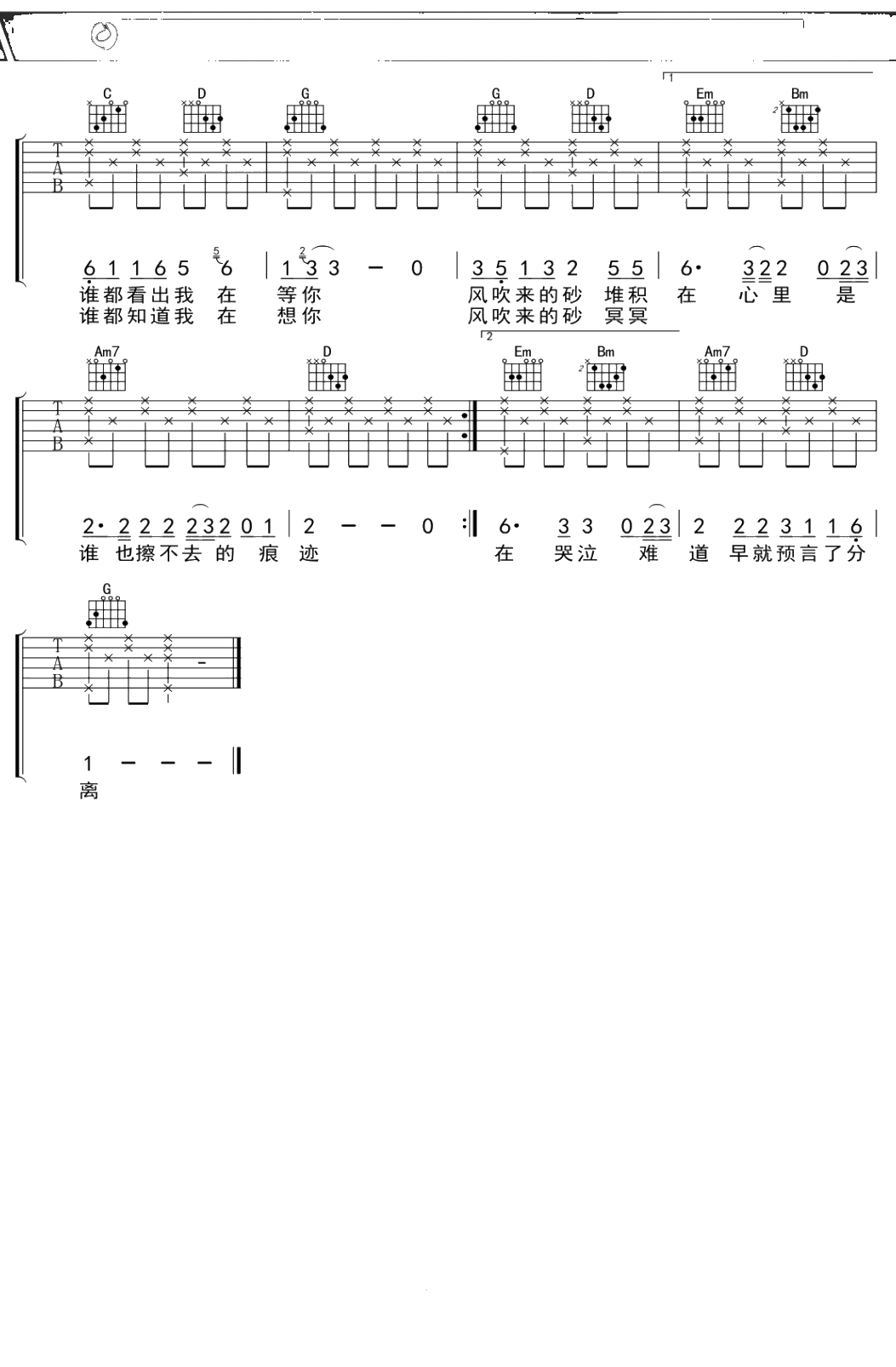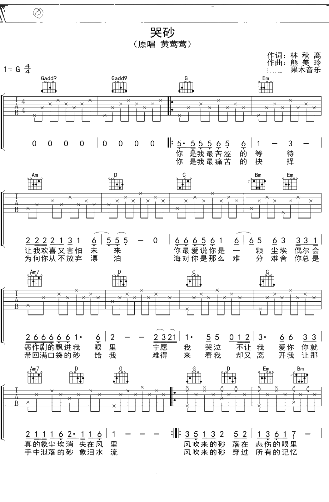 黄莺莺《哭砂》吉他谱 G调弹唱六线谱