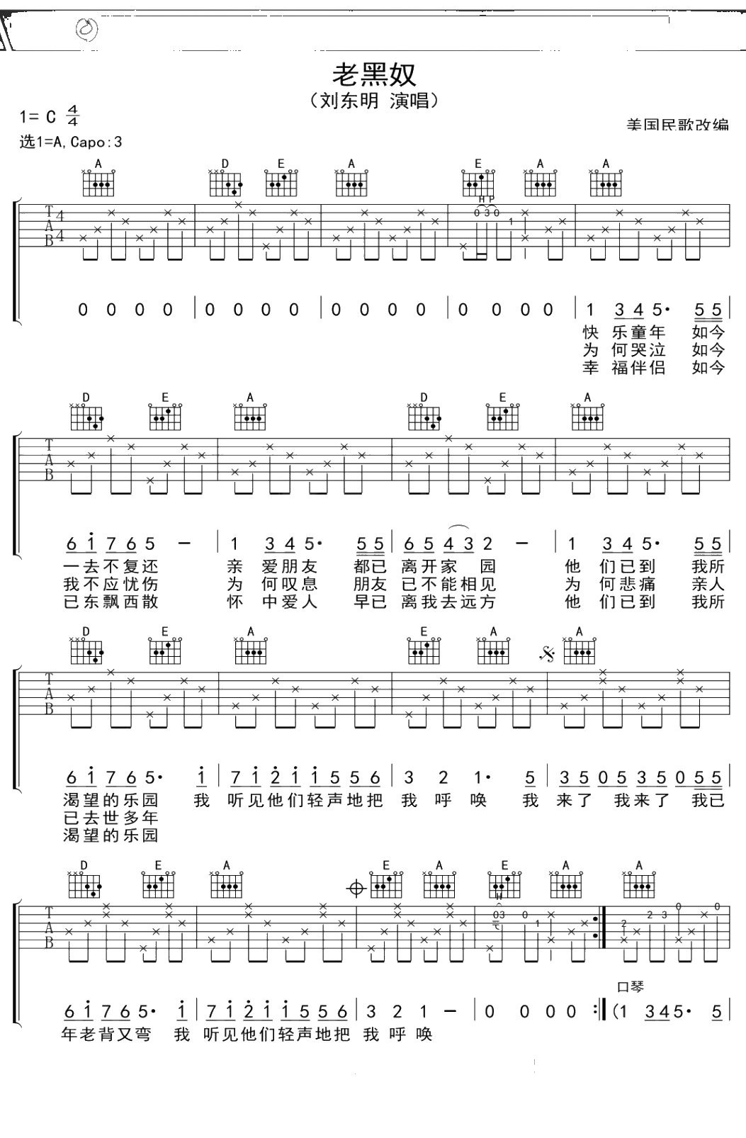 刘东明《老黑奴》吉他谱 A调弹唱六线谱