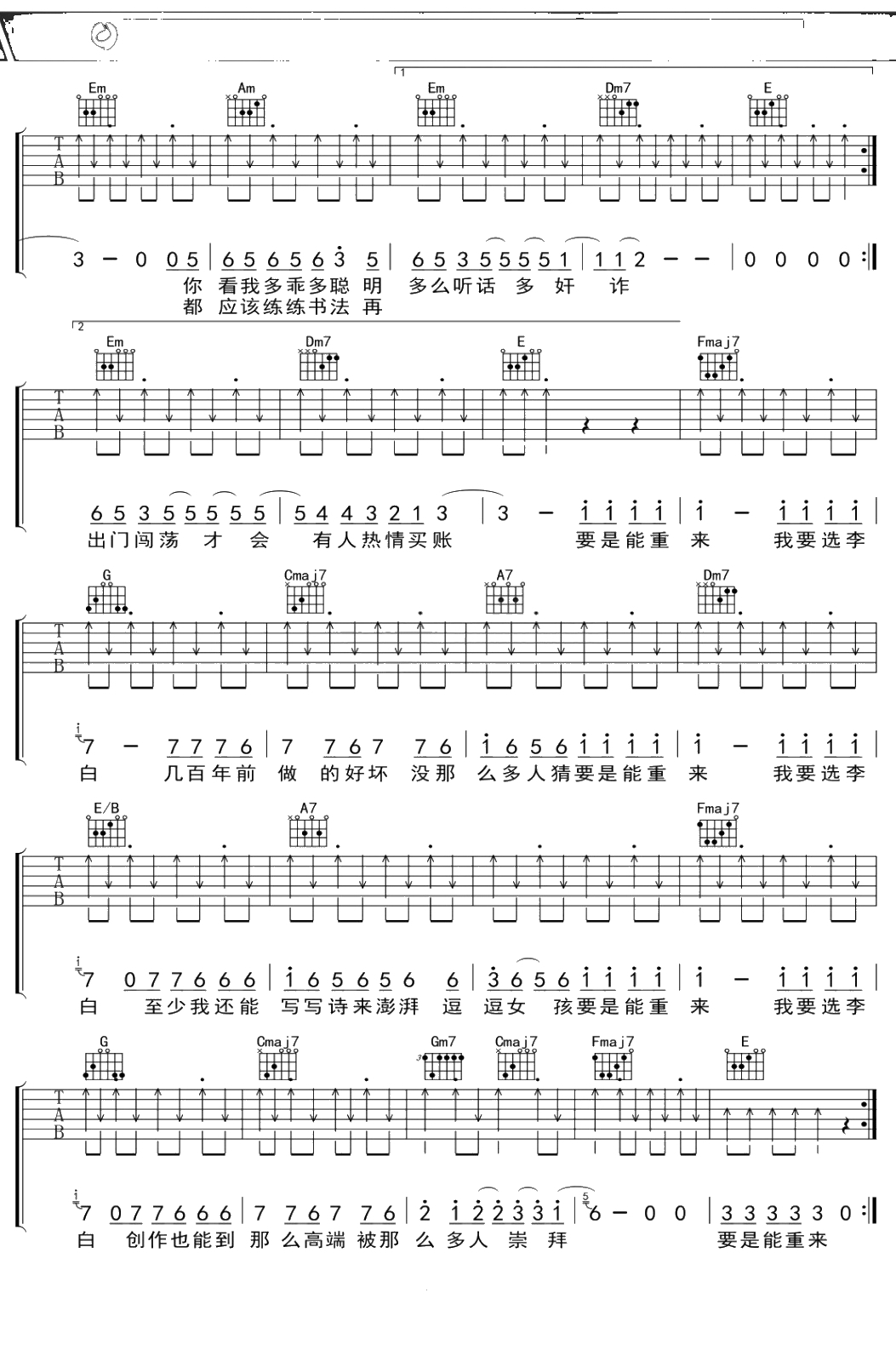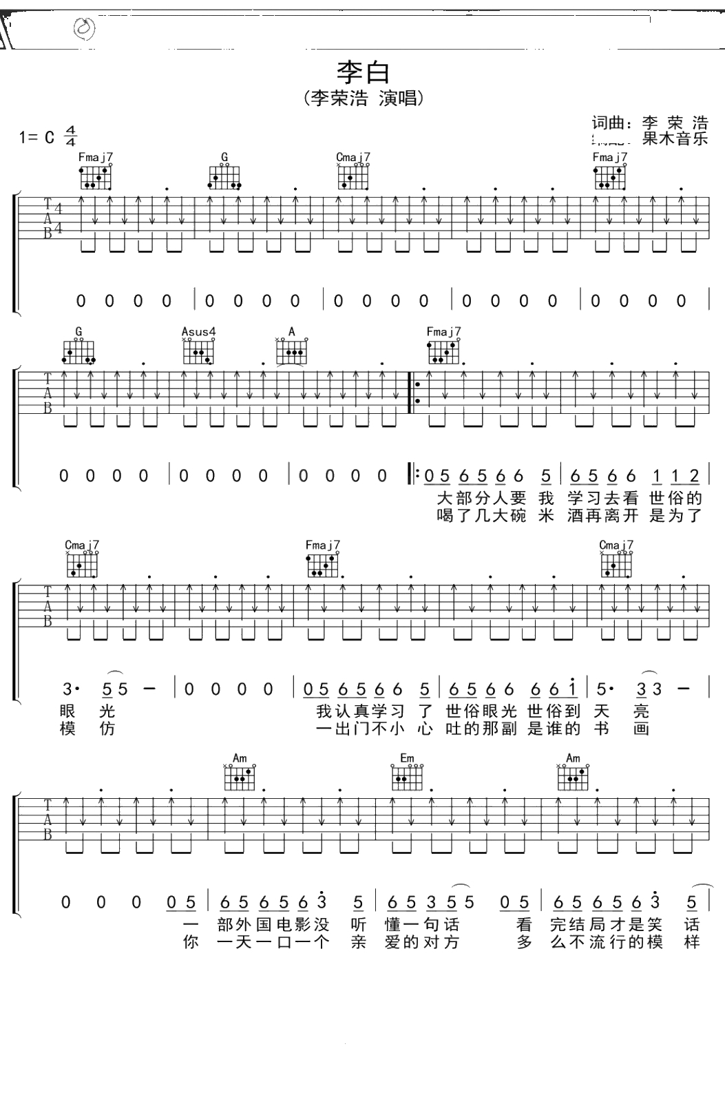 李荣浩《李白》吉他谱 C调弹唱六线谱
