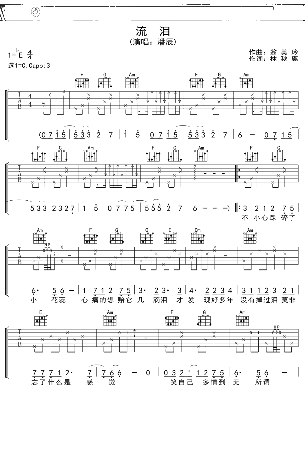 潘辰《流泪》吉他谱 C调弹唱六线谱
