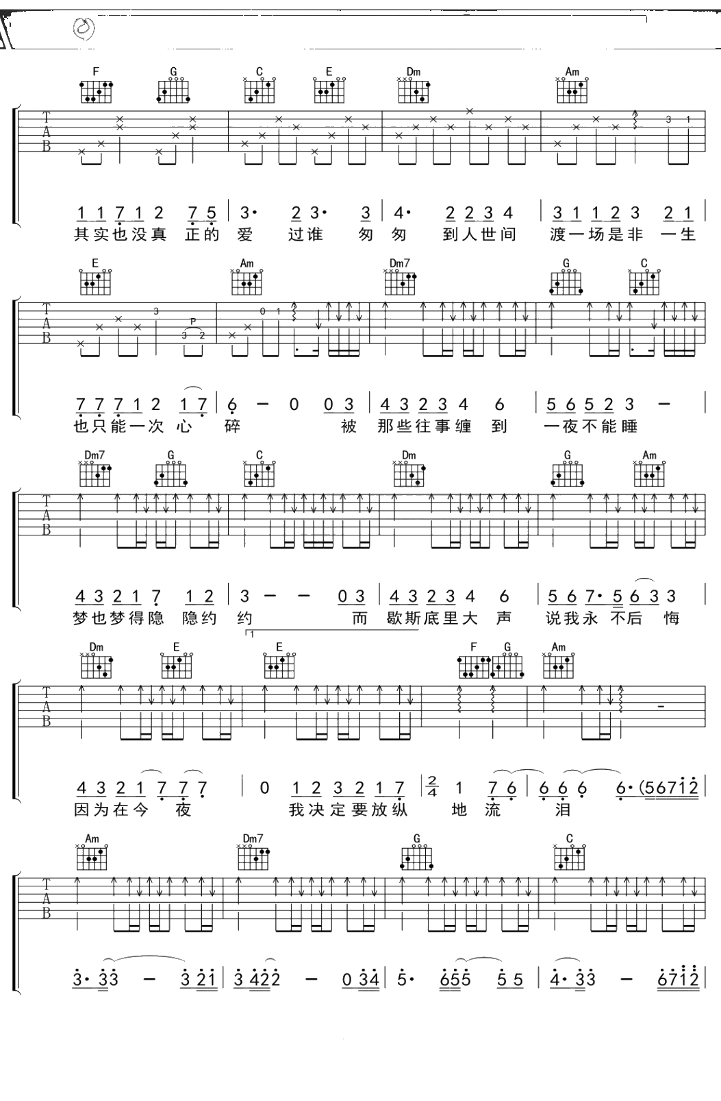 潘辰《流泪》吉他谱 C调弹唱六线谱吉他谱