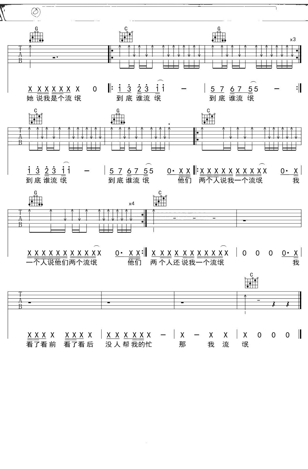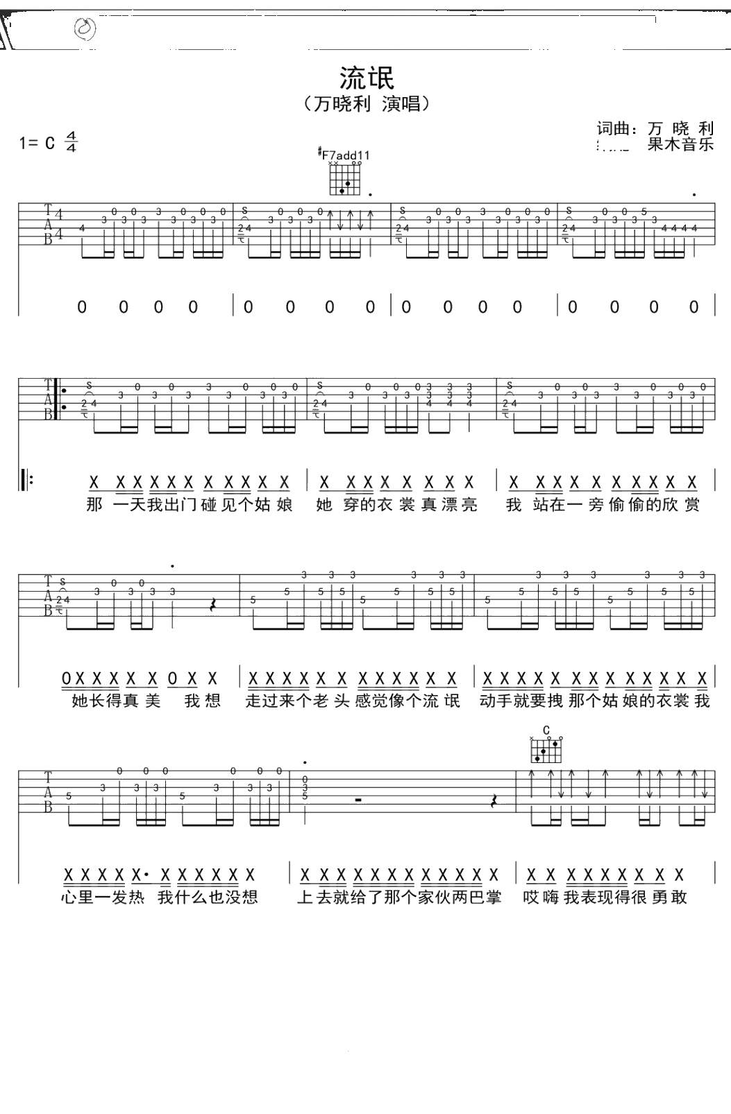 万晓利《流氓》吉他谱 C调弹唱六线谱