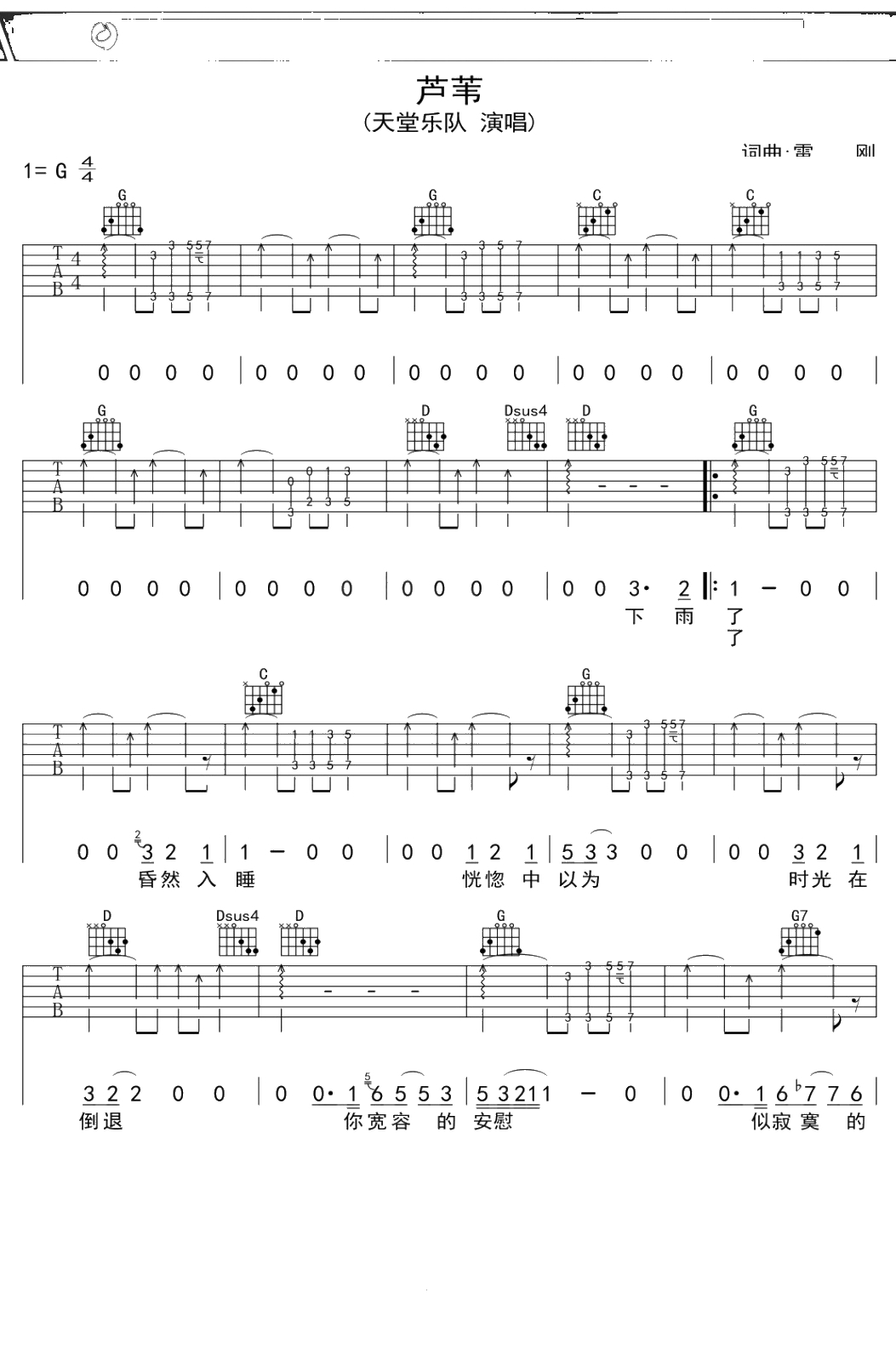 天堂乐队《芦苇》吉他谱 G调弹唱六线谱吉他谱