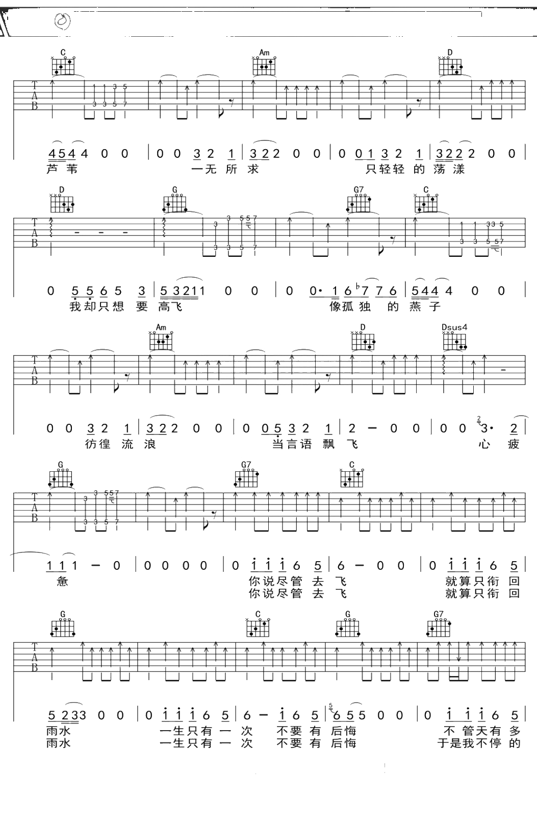 天堂乐队《芦苇》吉他谱 G调弹唱六线谱