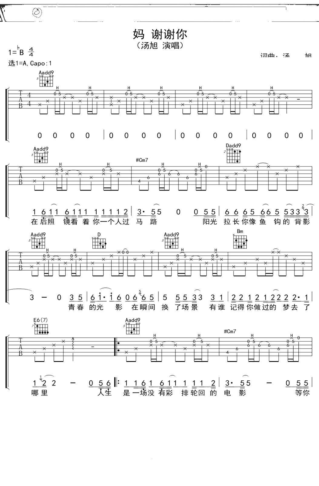 汤旭《妈,谢谢你》吉他谱 A调弹唱六线谱吉他谱