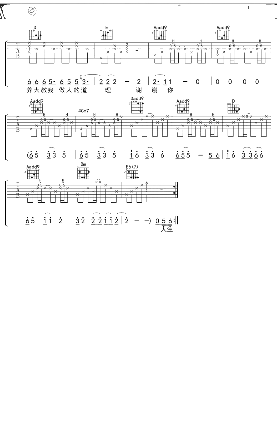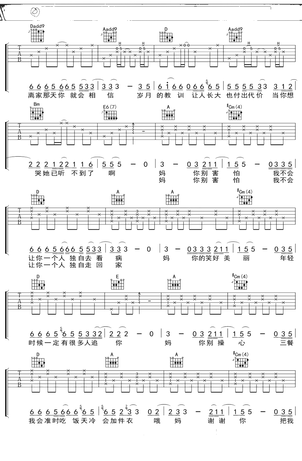 汤旭《妈,谢谢你》吉他谱 A调弹唱六线谱