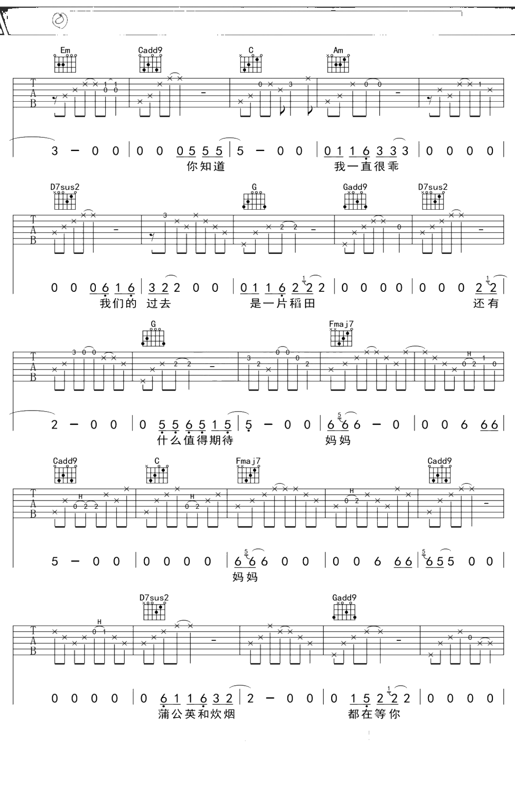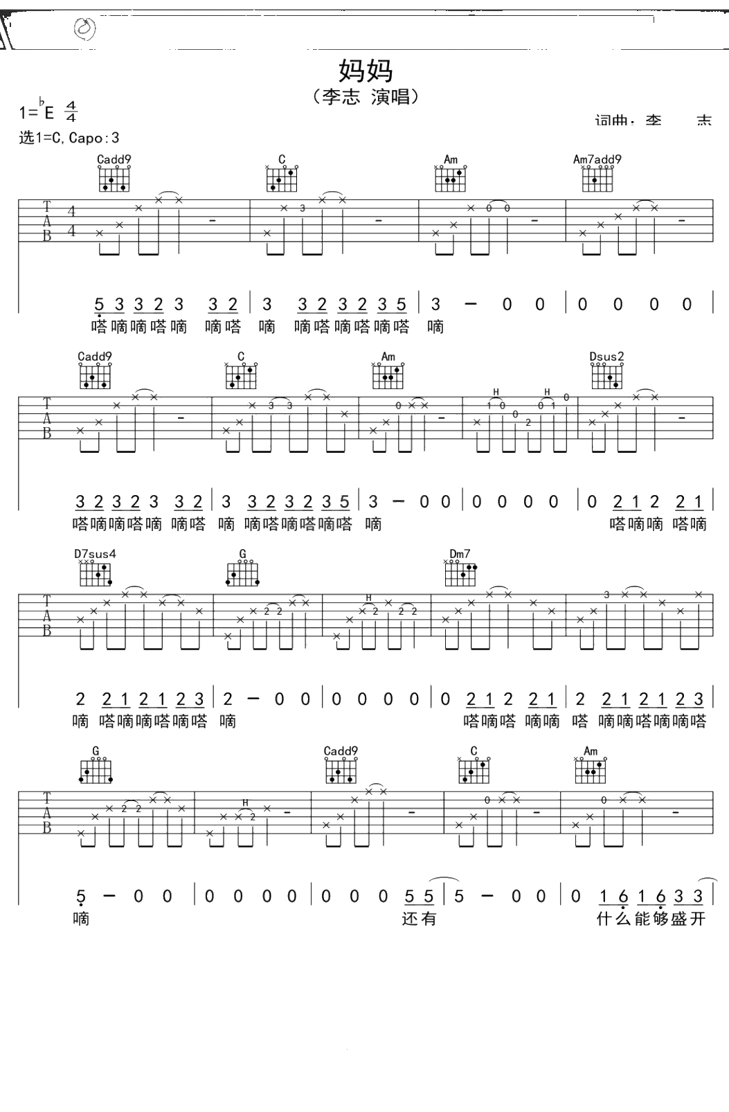 李志《妈妈》吉他谱 C调弹唱六线谱吉他谱