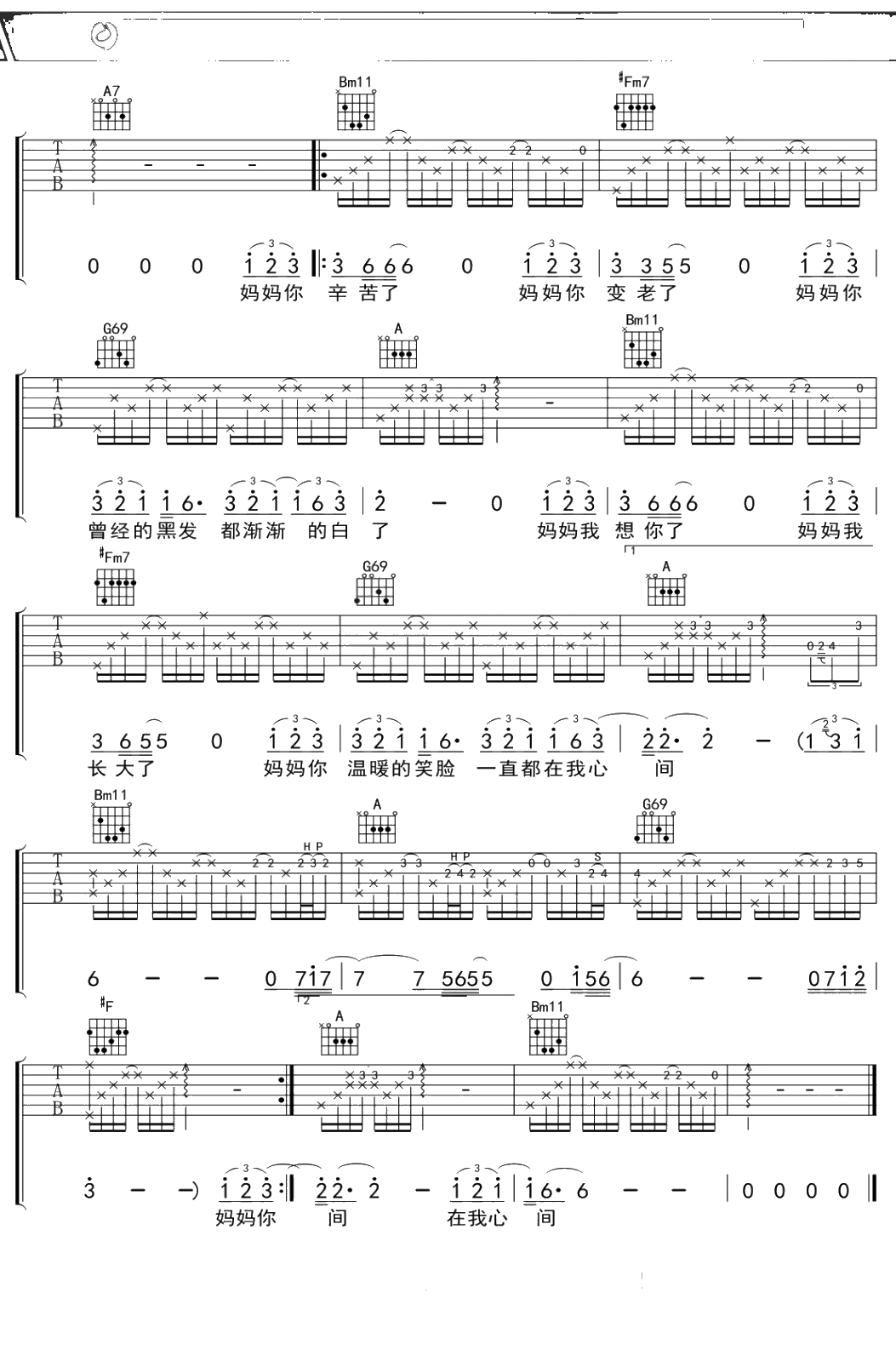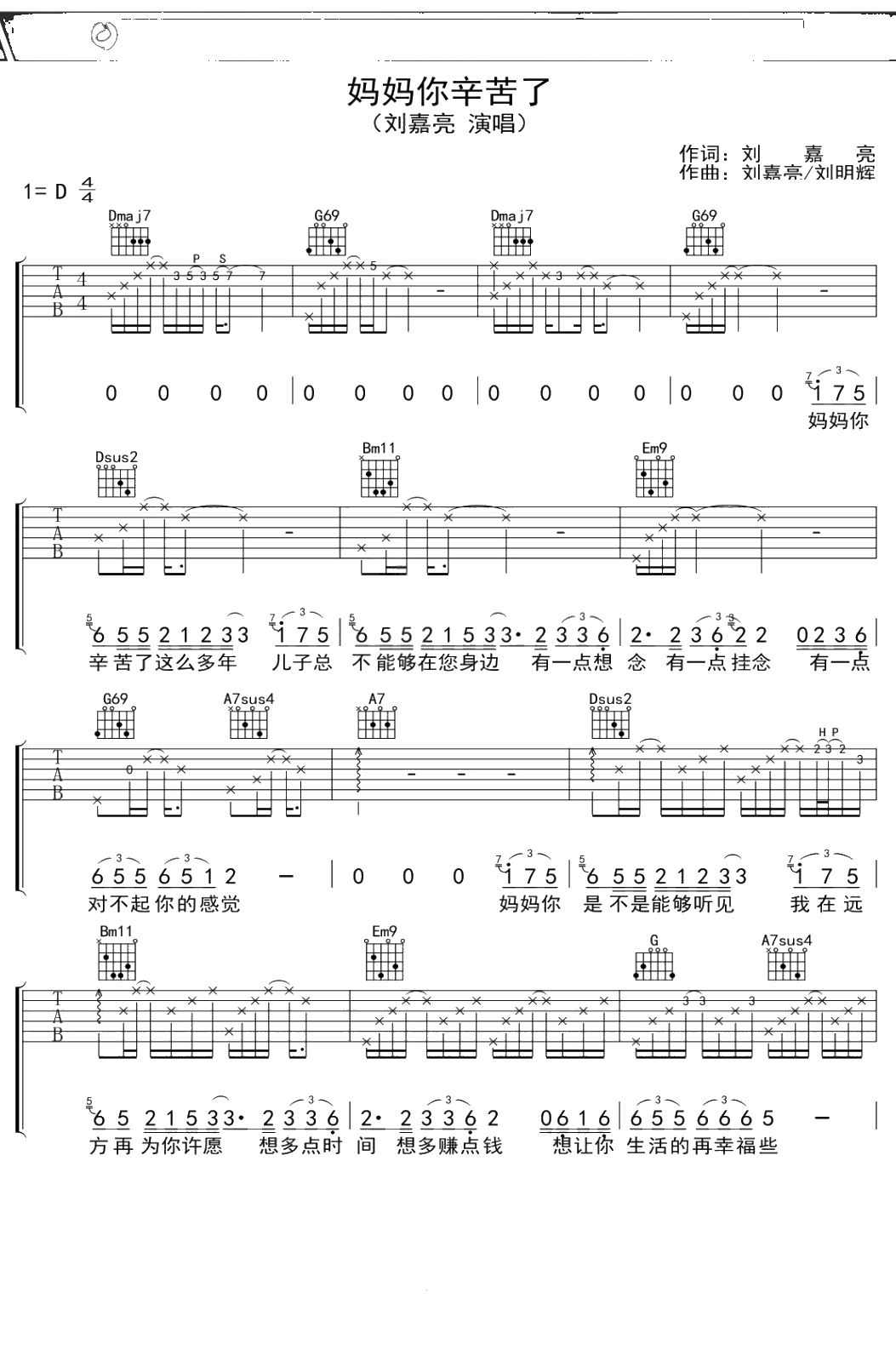 刘嘉亮《妈妈你辛苦了》吉他谱 D调弹唱六线谱吉他谱