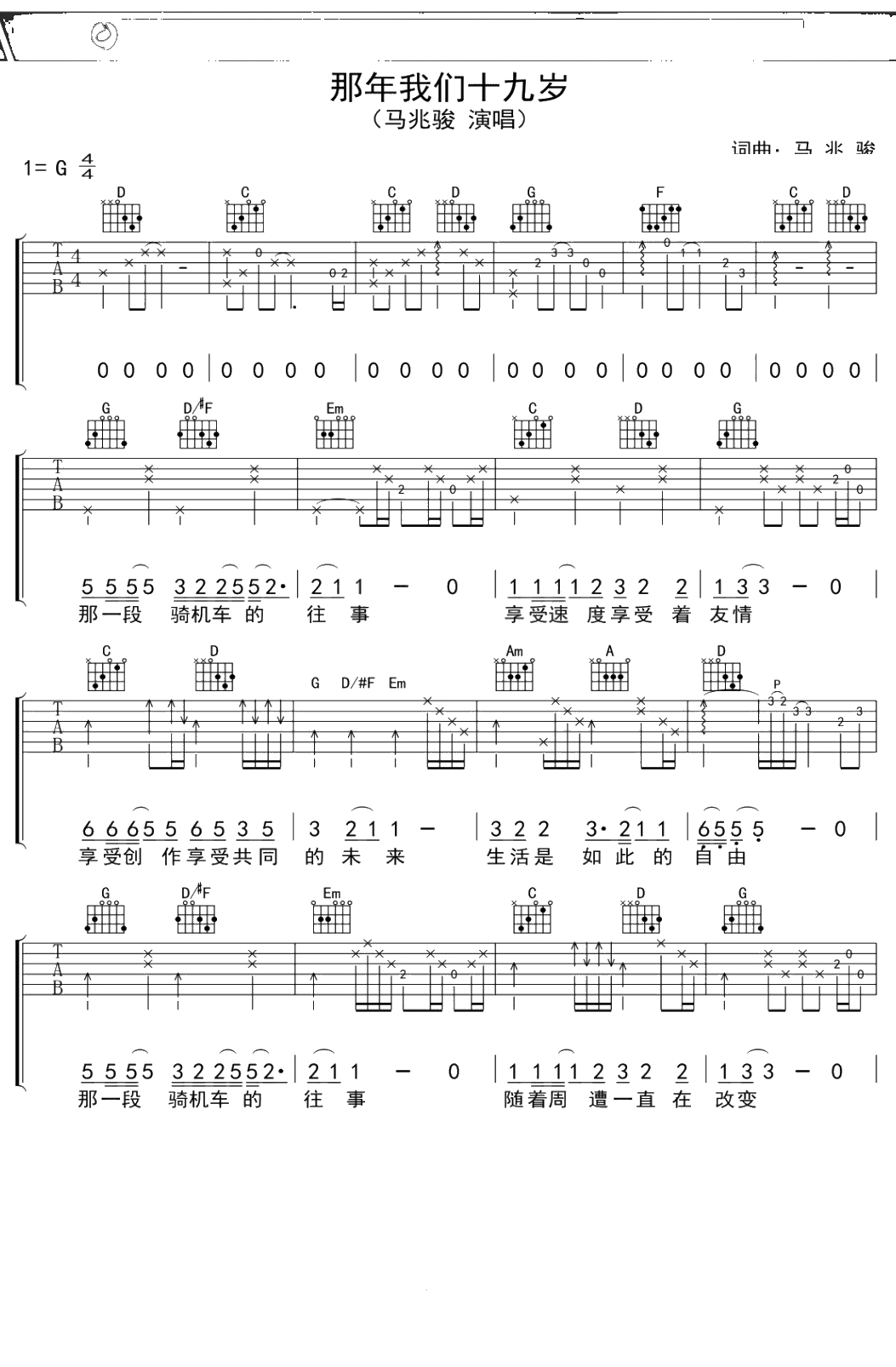 马兆骏《那年我们十九岁》吉他谱 G调弹唱六线谱
