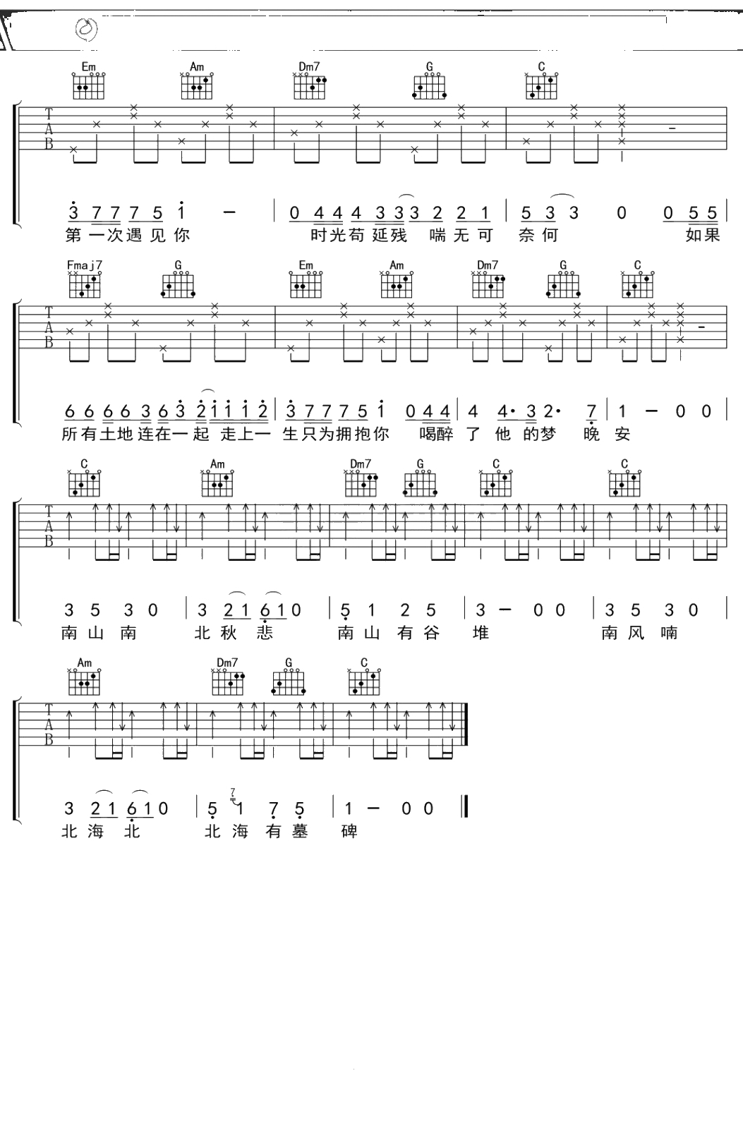 马頔《南山南》简单版吉他谱 C调弹唱六线谱吉他谱