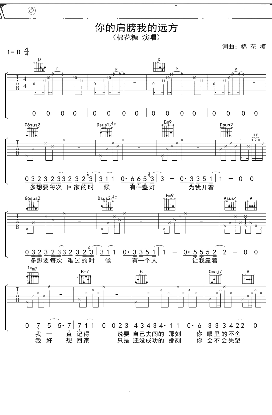 棉花糖《你的肩膀我的远方》吉他谱 D调弹唱六线谱吉他谱