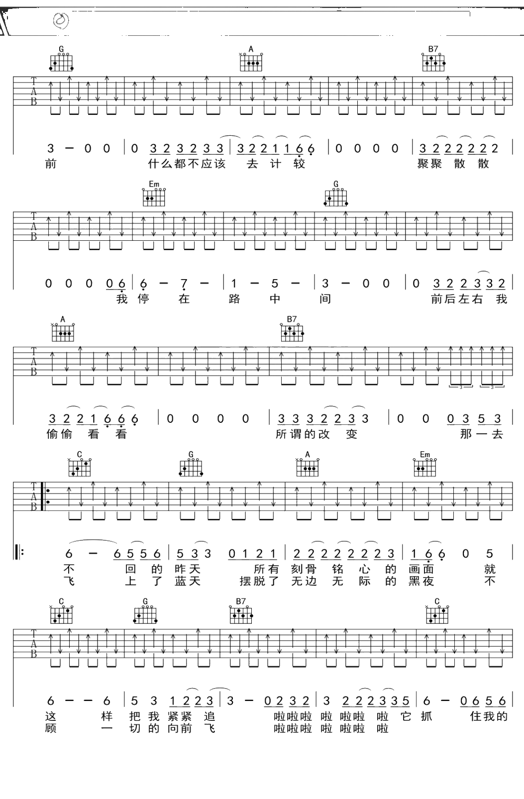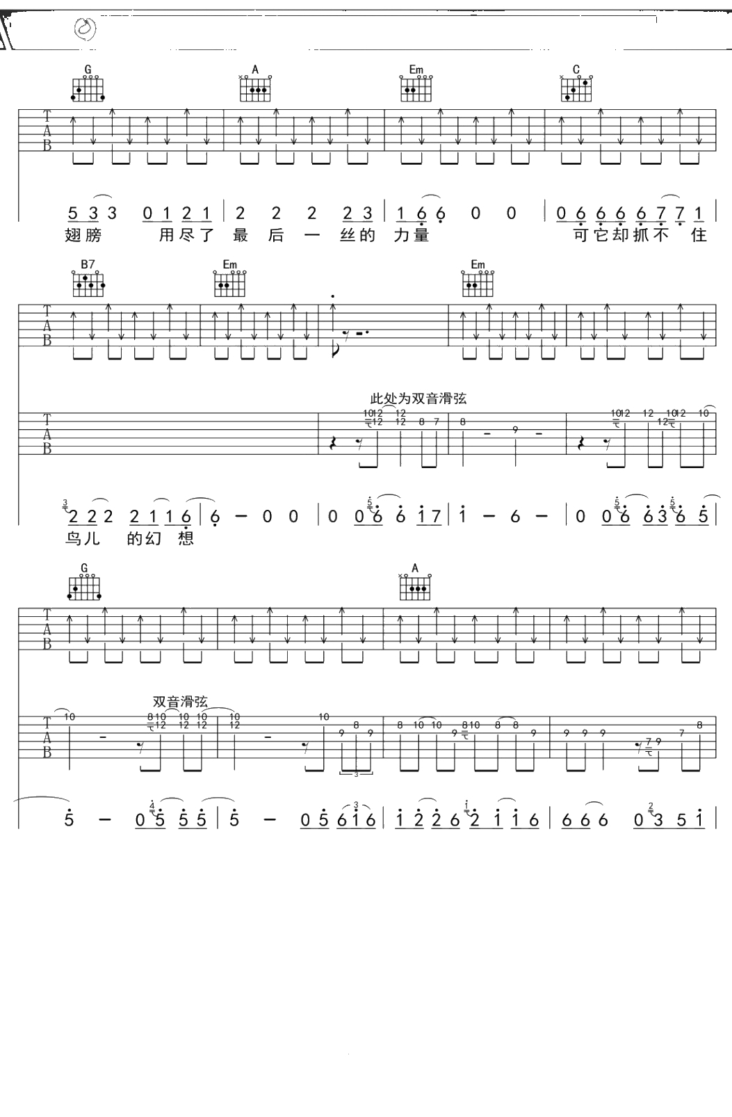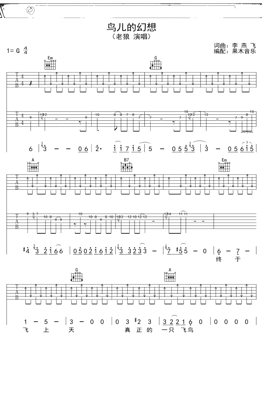 老狼《鸟儿的幻想》吉他谱 G调弹唱六线谱