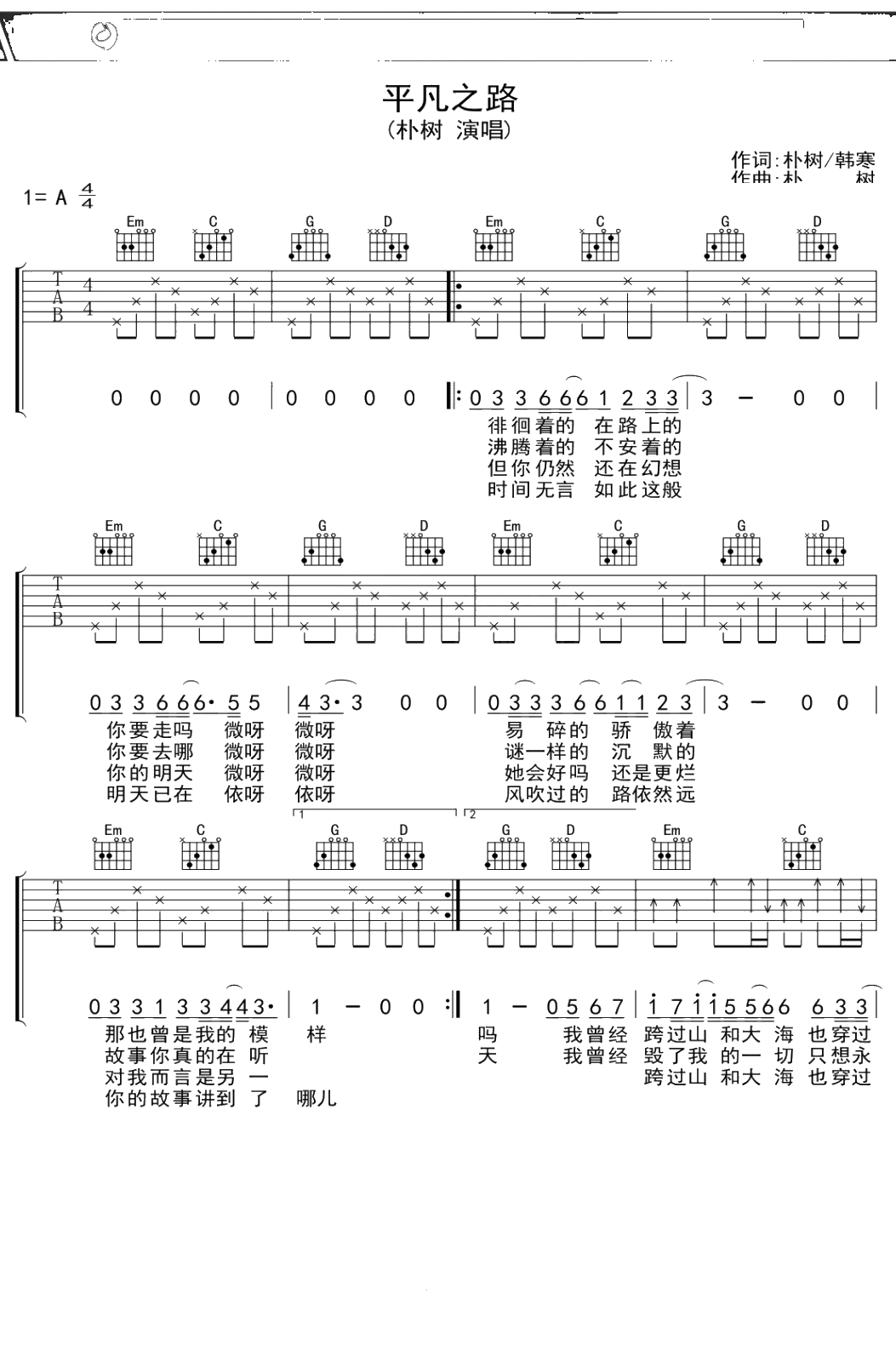 朴树《平凡之路》简化版吉他谱 弹唱六线谱