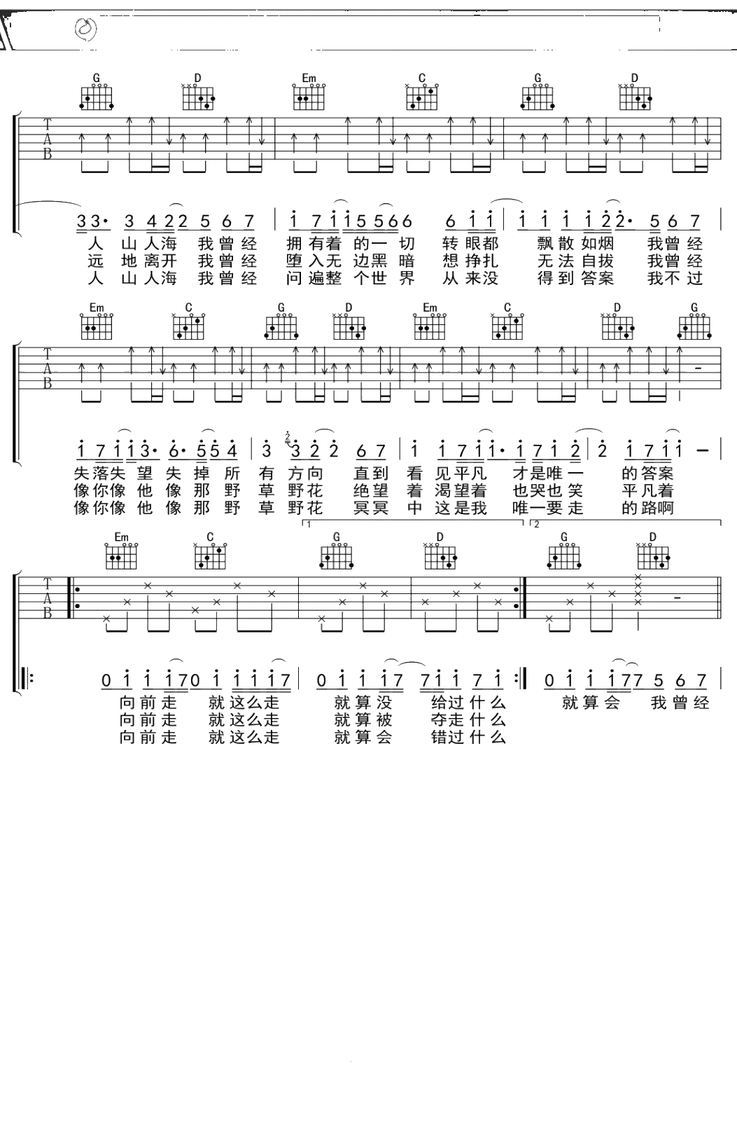 朴树《平凡之路》简化版吉他谱 弹唱六线谱吉他谱