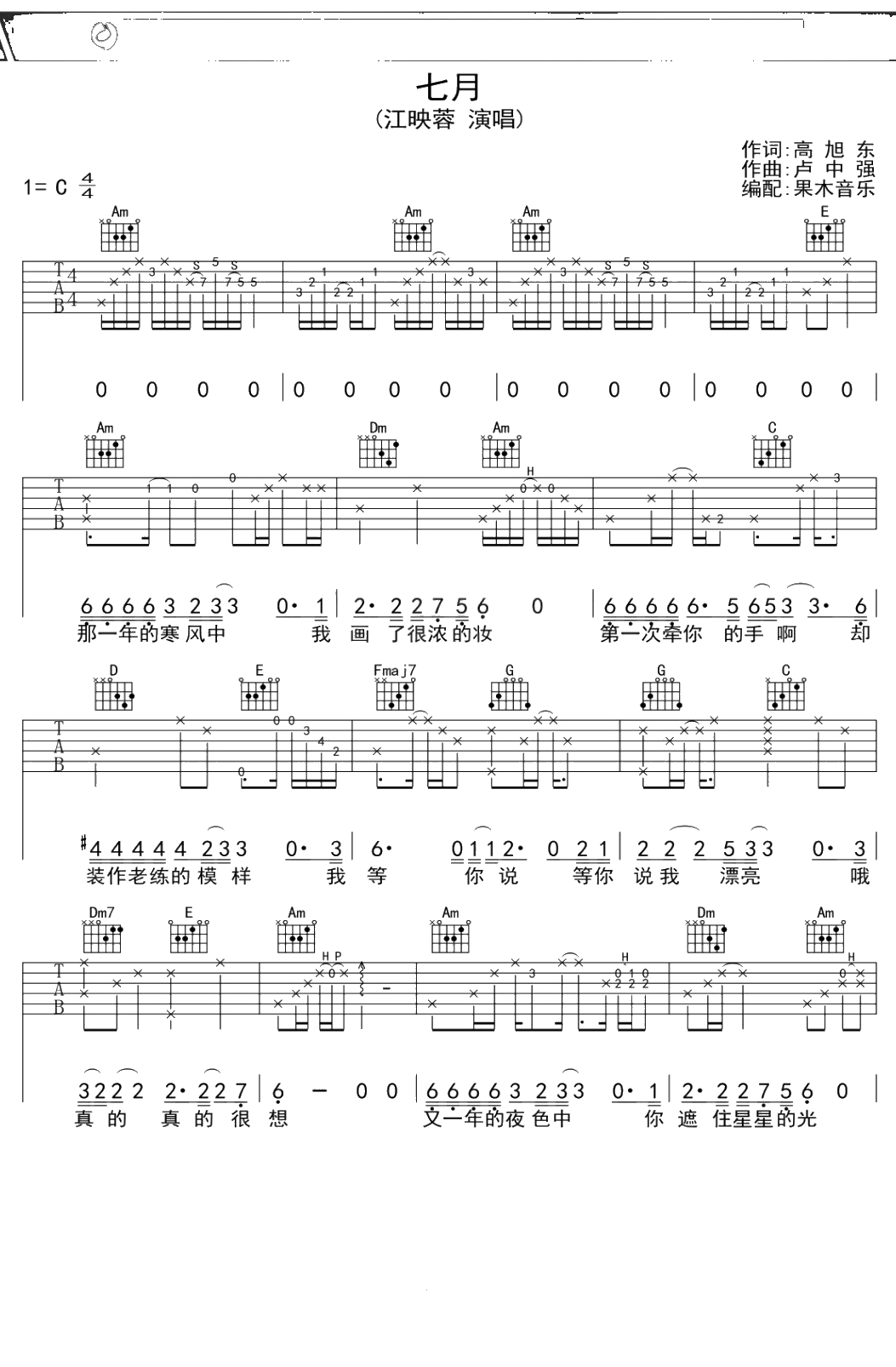 江映蓉《七月》吉他谱 C调弹唱六线谱