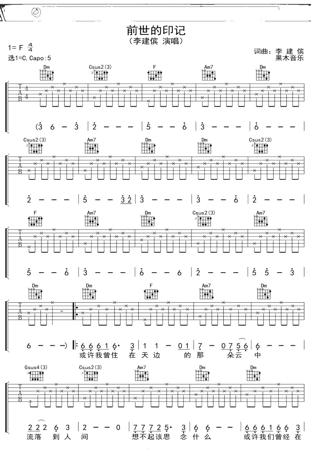 李建滨《前世的记忆》吉他谱 C调弹唱六线谱