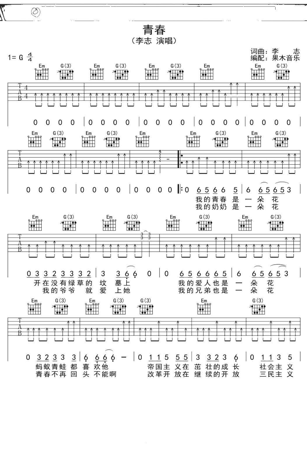 李志《青春》吉他谱 G调弹唱六线谱