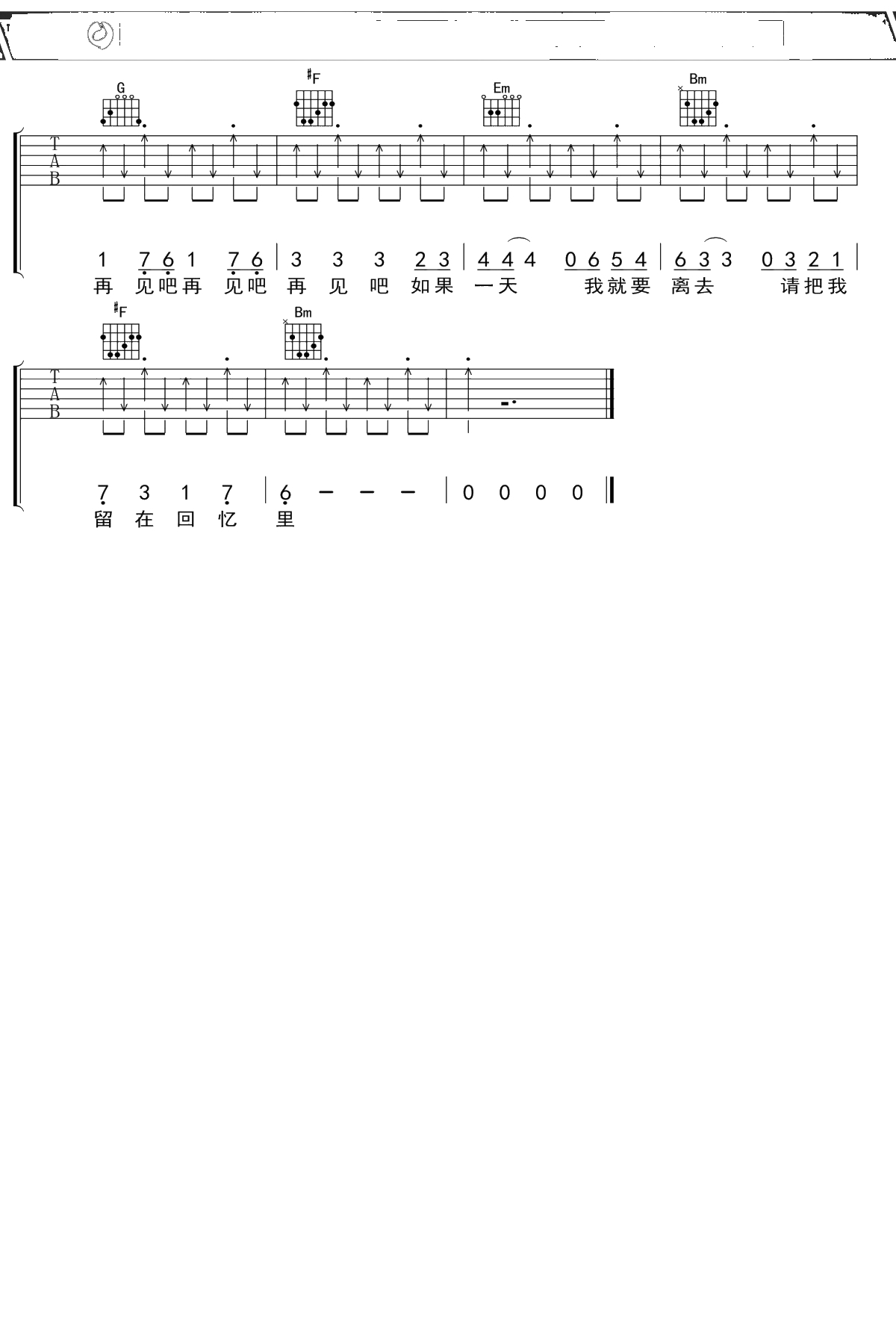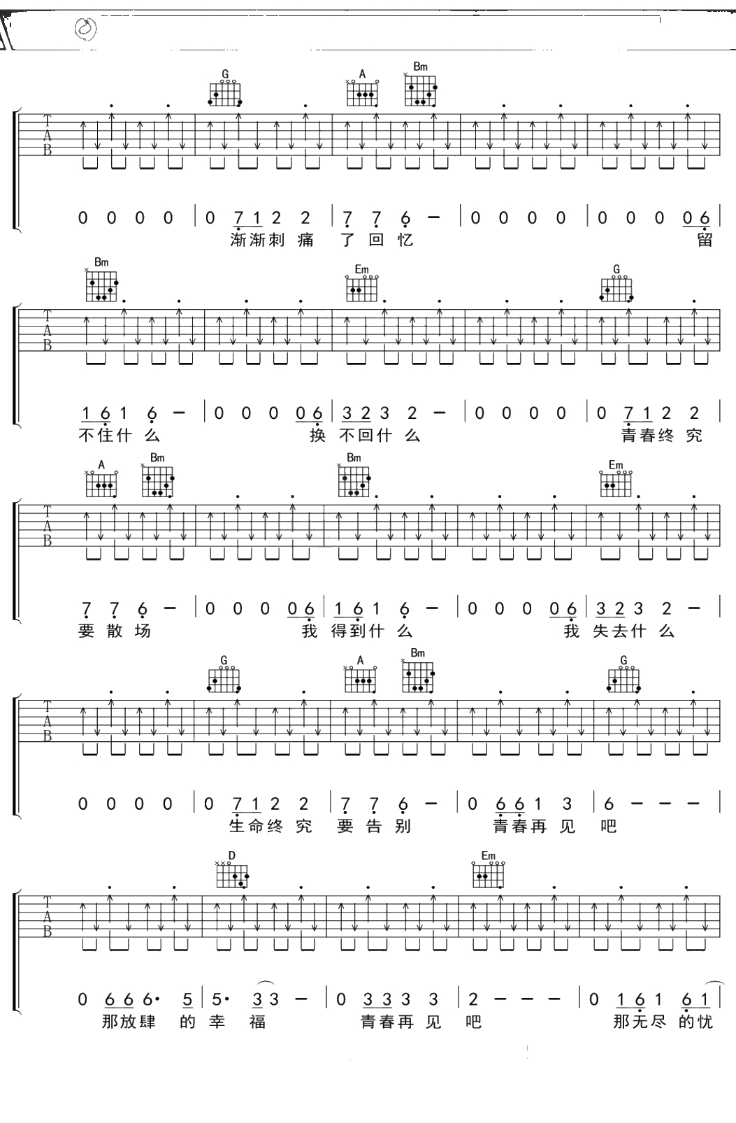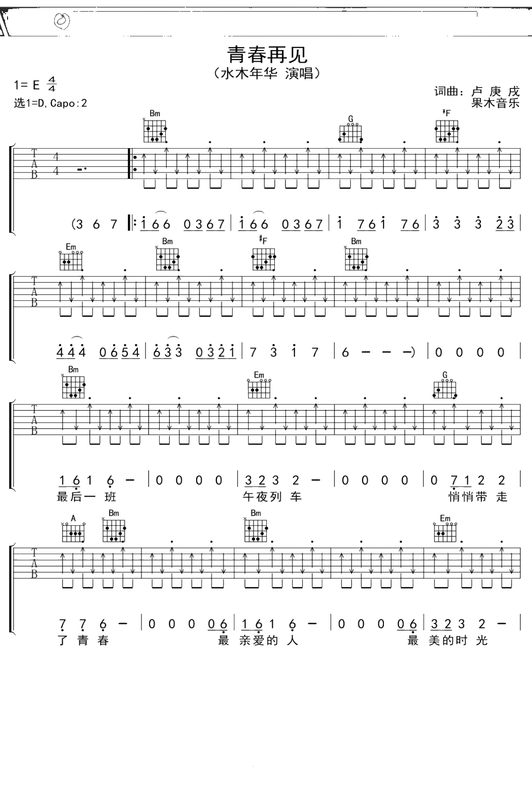 水木年华《青春再见》吉他谱 D调弹唱六线谱