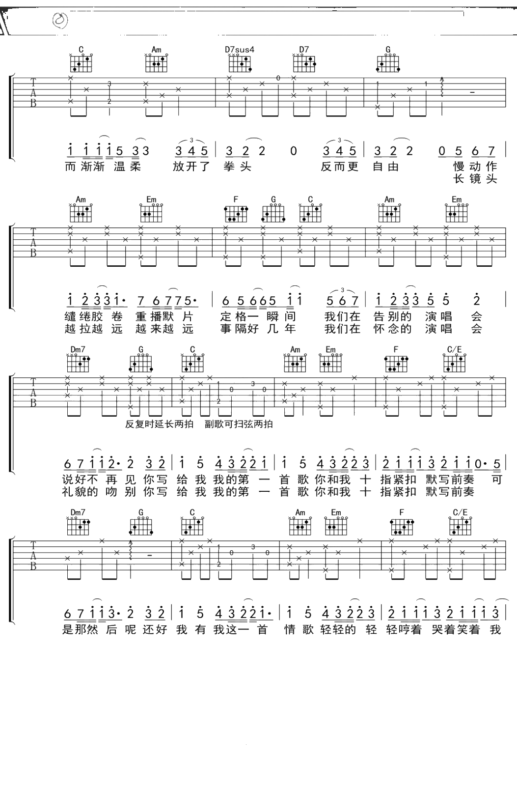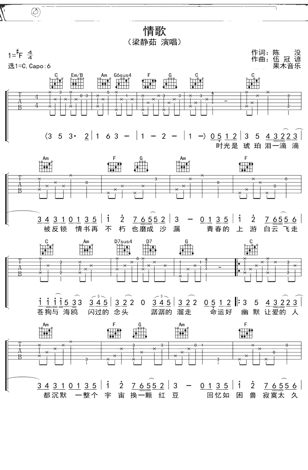 梁静茹《情歌》吉他谱 C调弹唱六线谱吉他谱