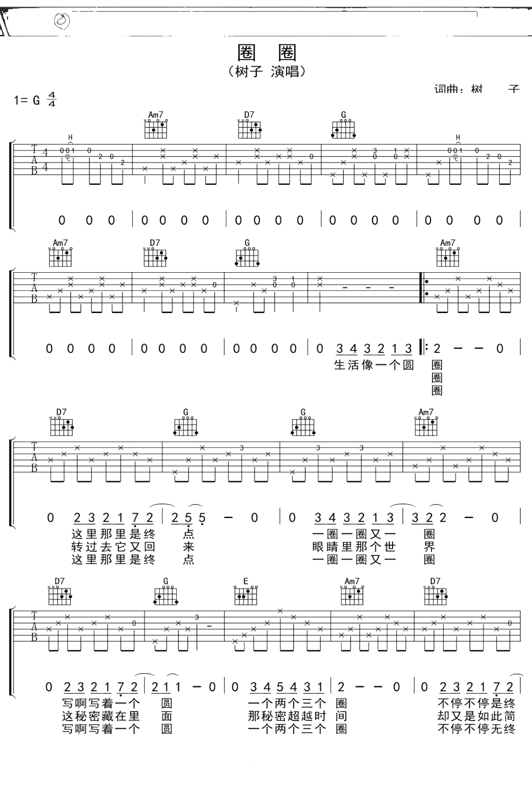 树子《圈圈》吉他谱 G调弹唱六线谱吉他谱