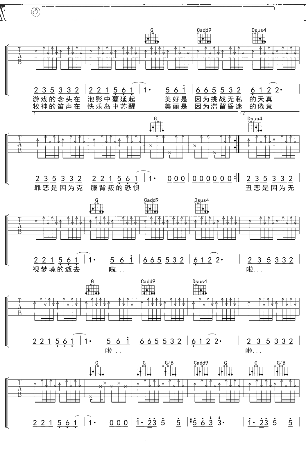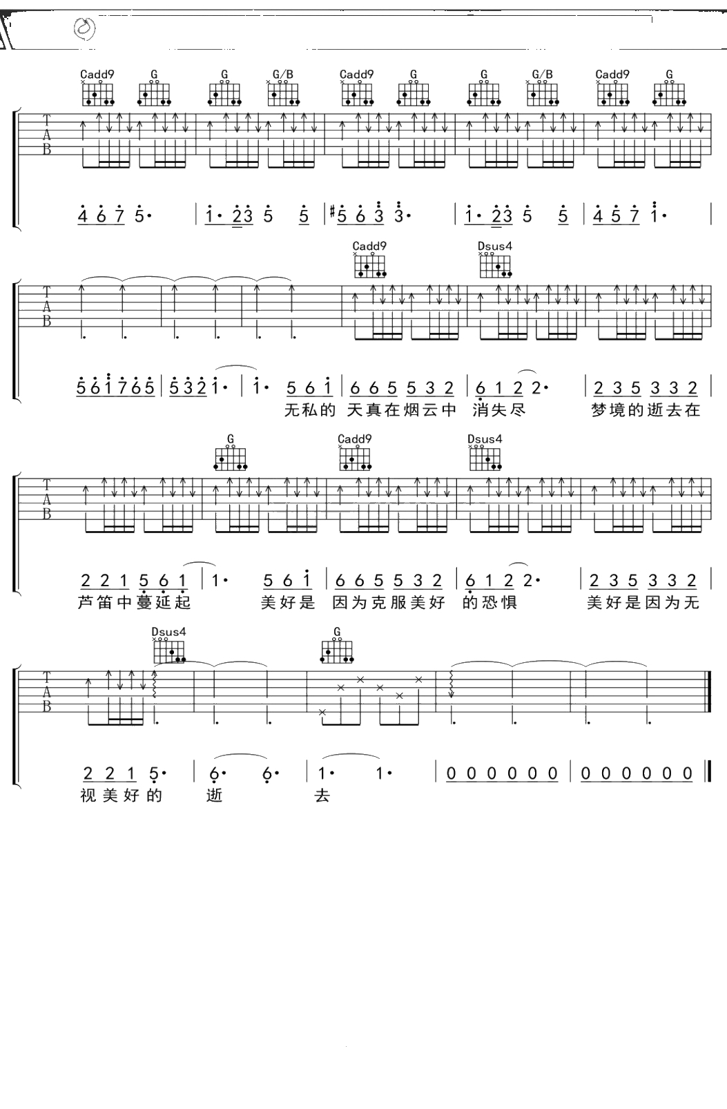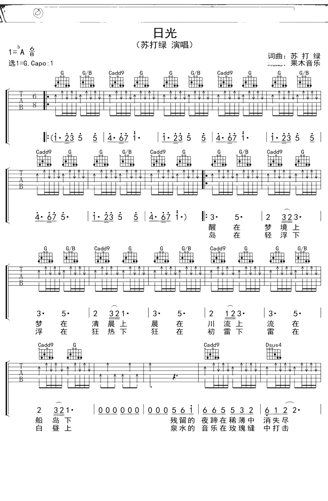苏打绿《日光》吉他谱 G调弹唱六线谱