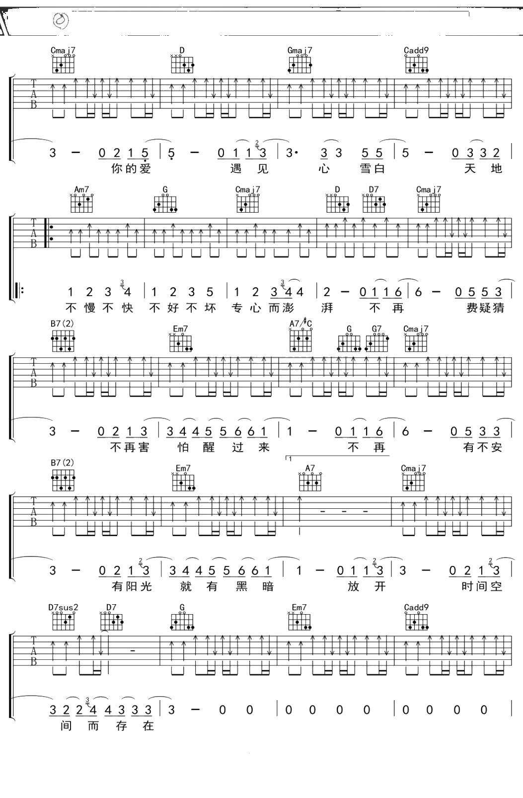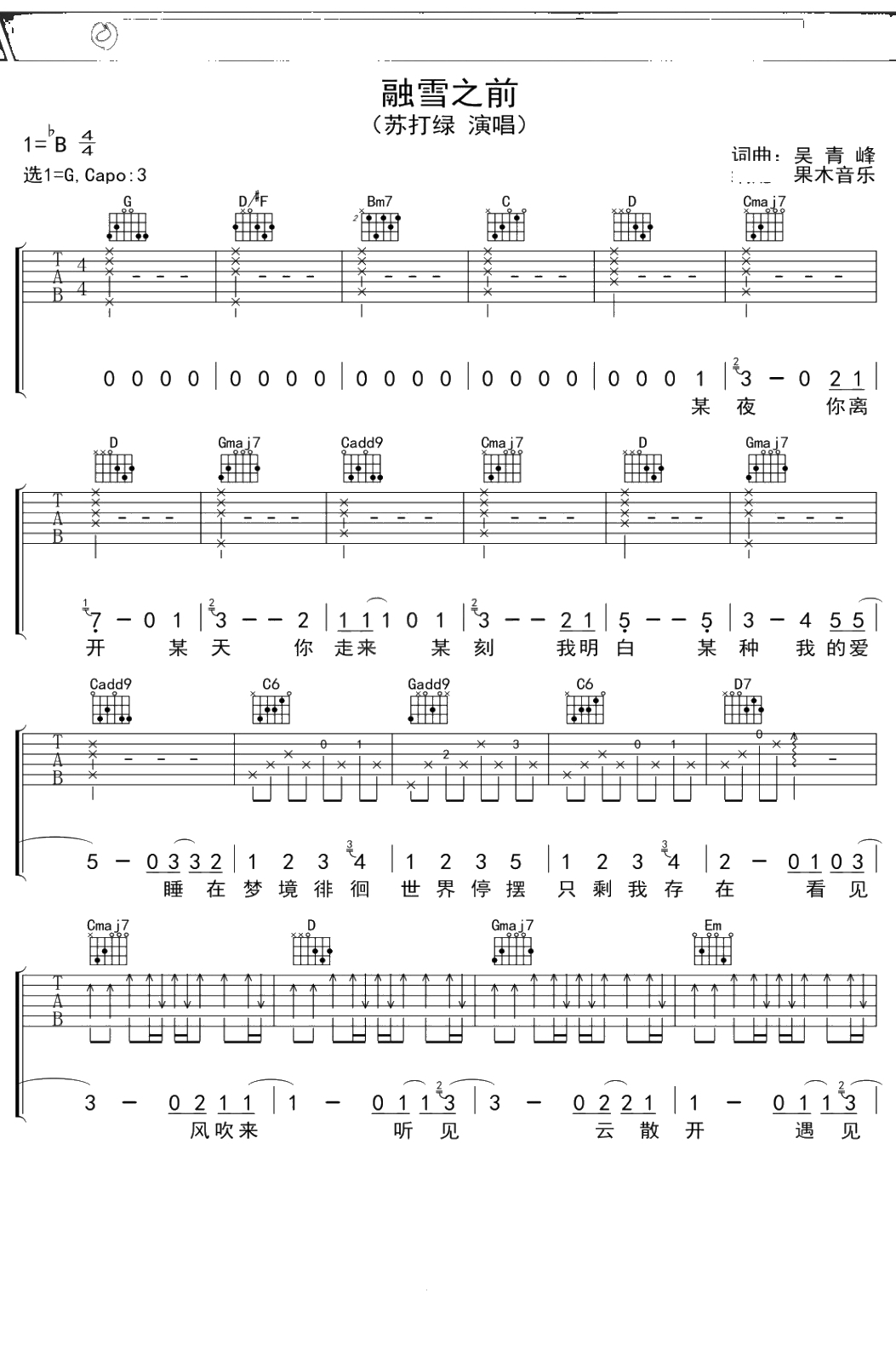苏打绿《融雪之前》吉他谱 G调弹唱六线谱