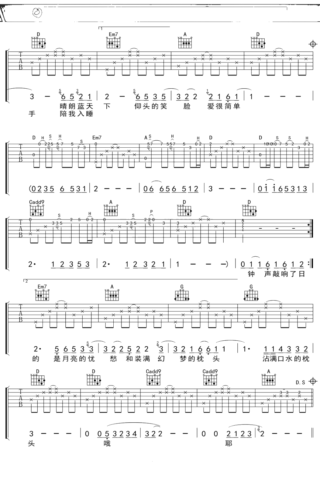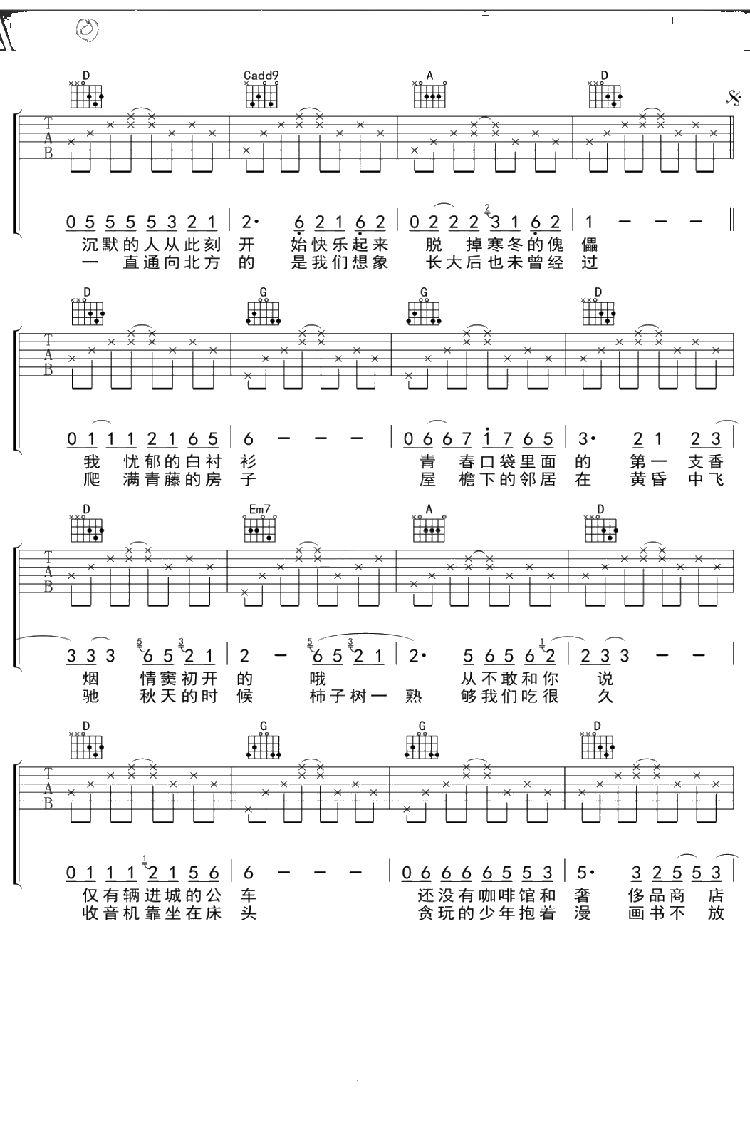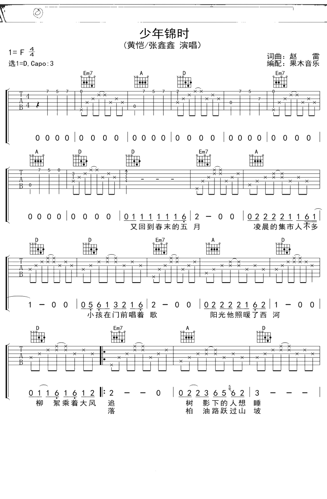《少年锦时》吉他谱 黄凯/张鑫鑫版 D调弹唱六线谱