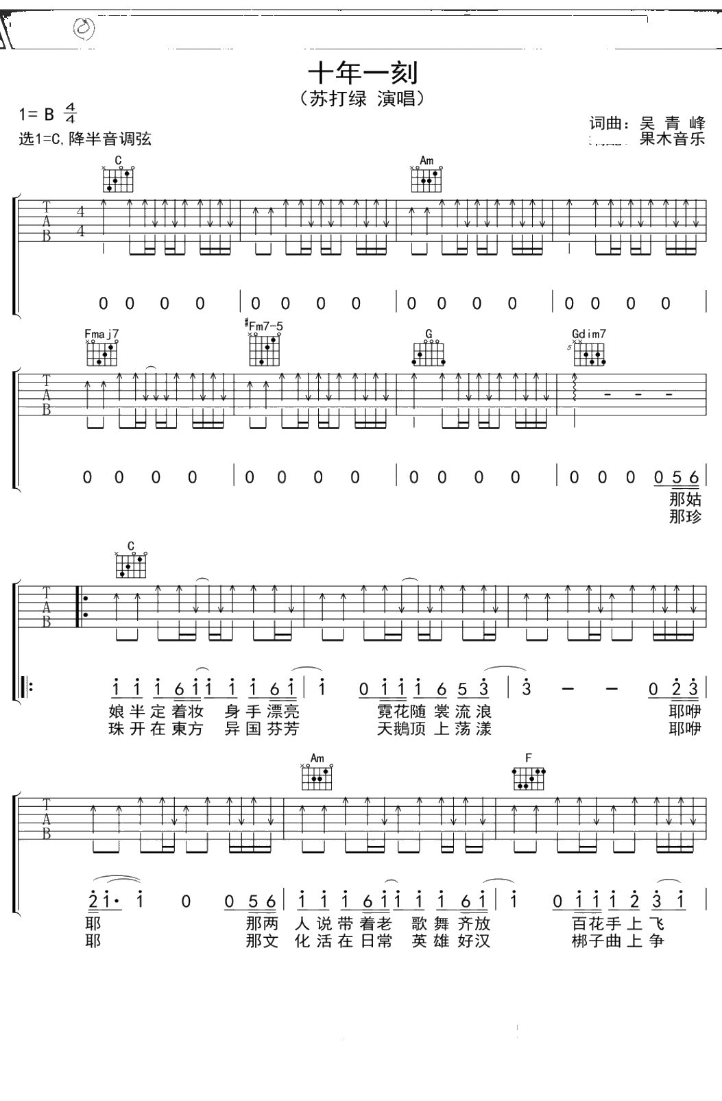 苏打绿《十年一刻》吉他谱 C调弹唱六线谱吉他谱