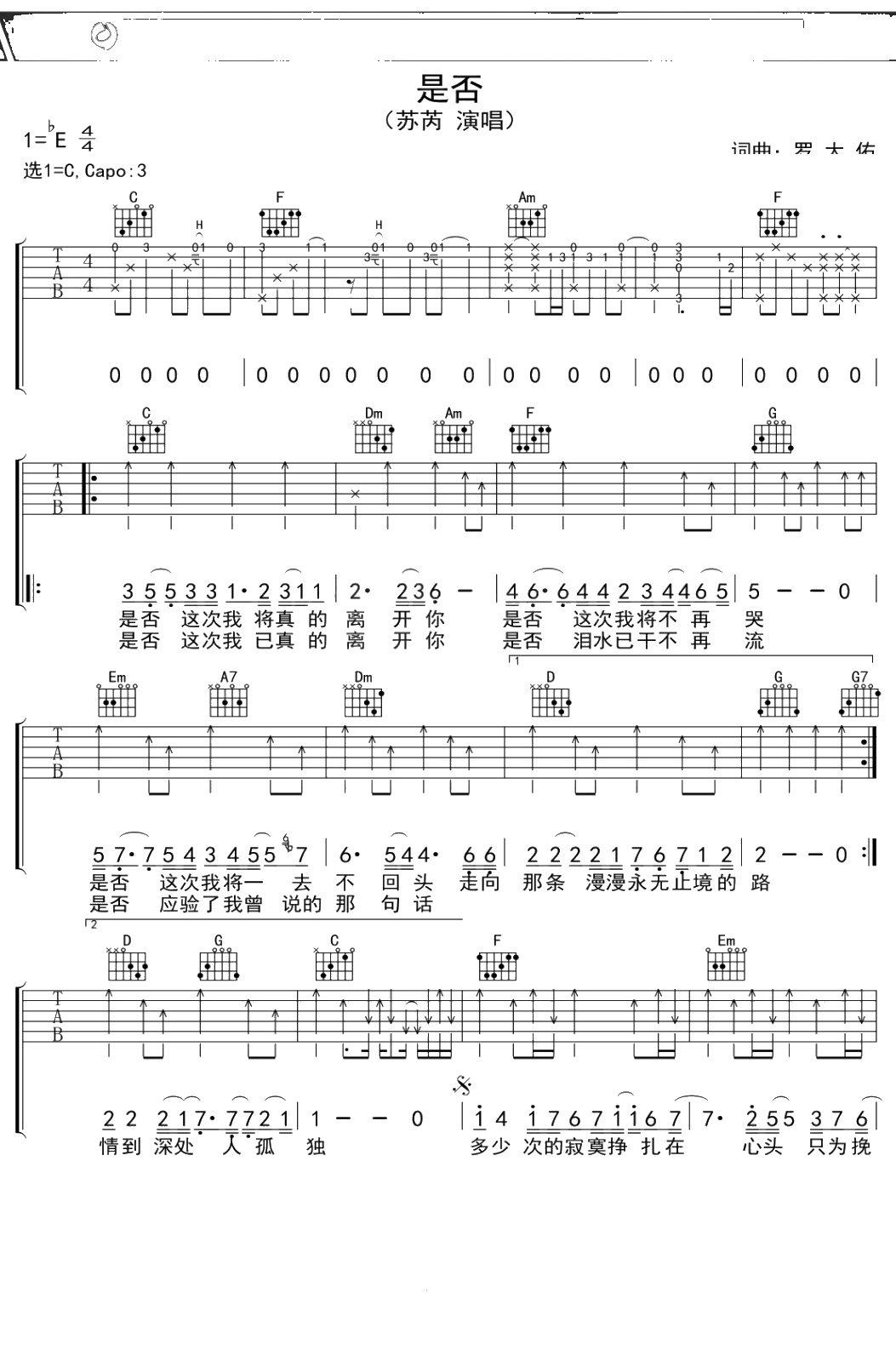 苏芮《是否》吉他谱 C调弹唱六线谱吉他谱