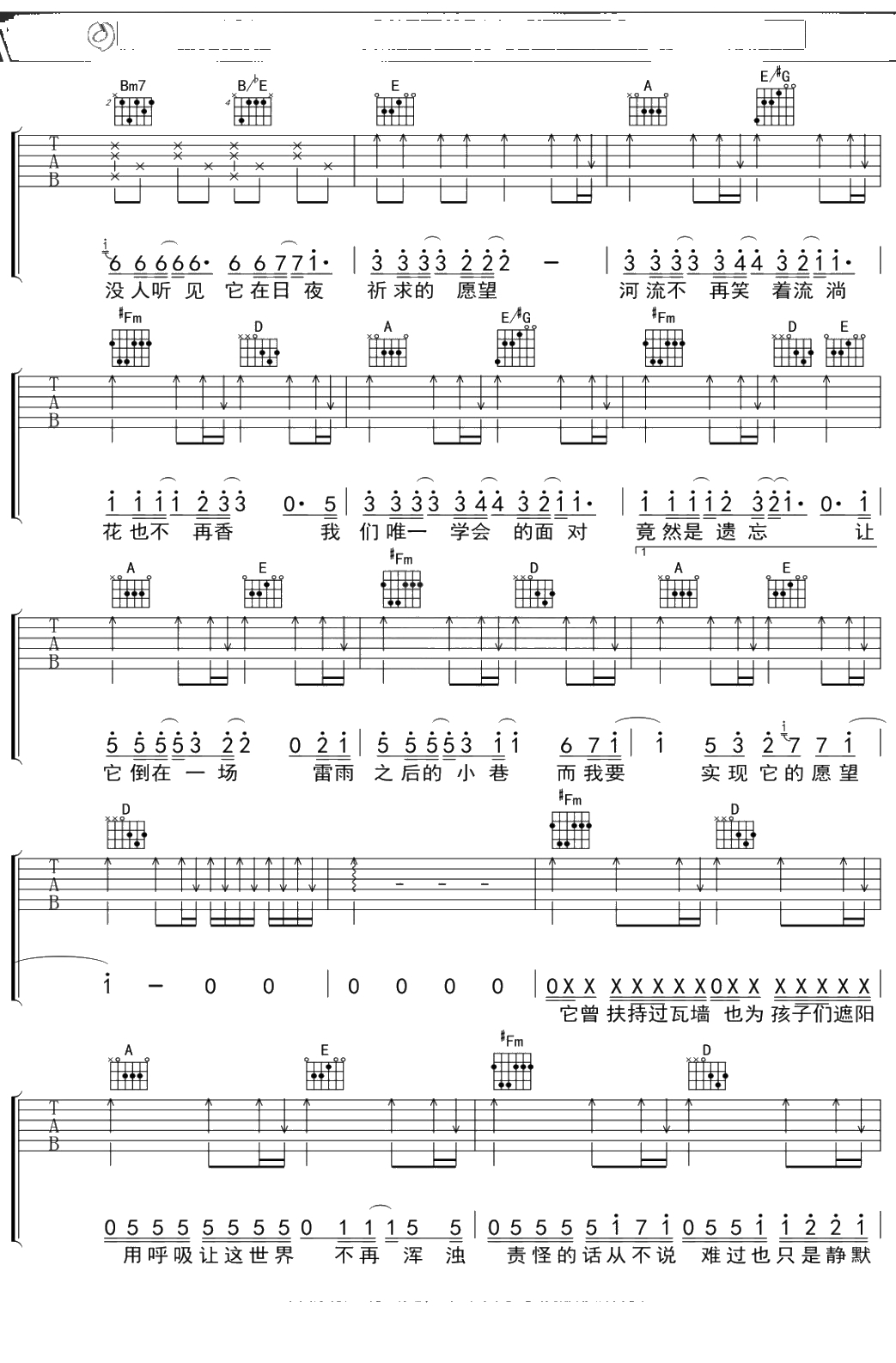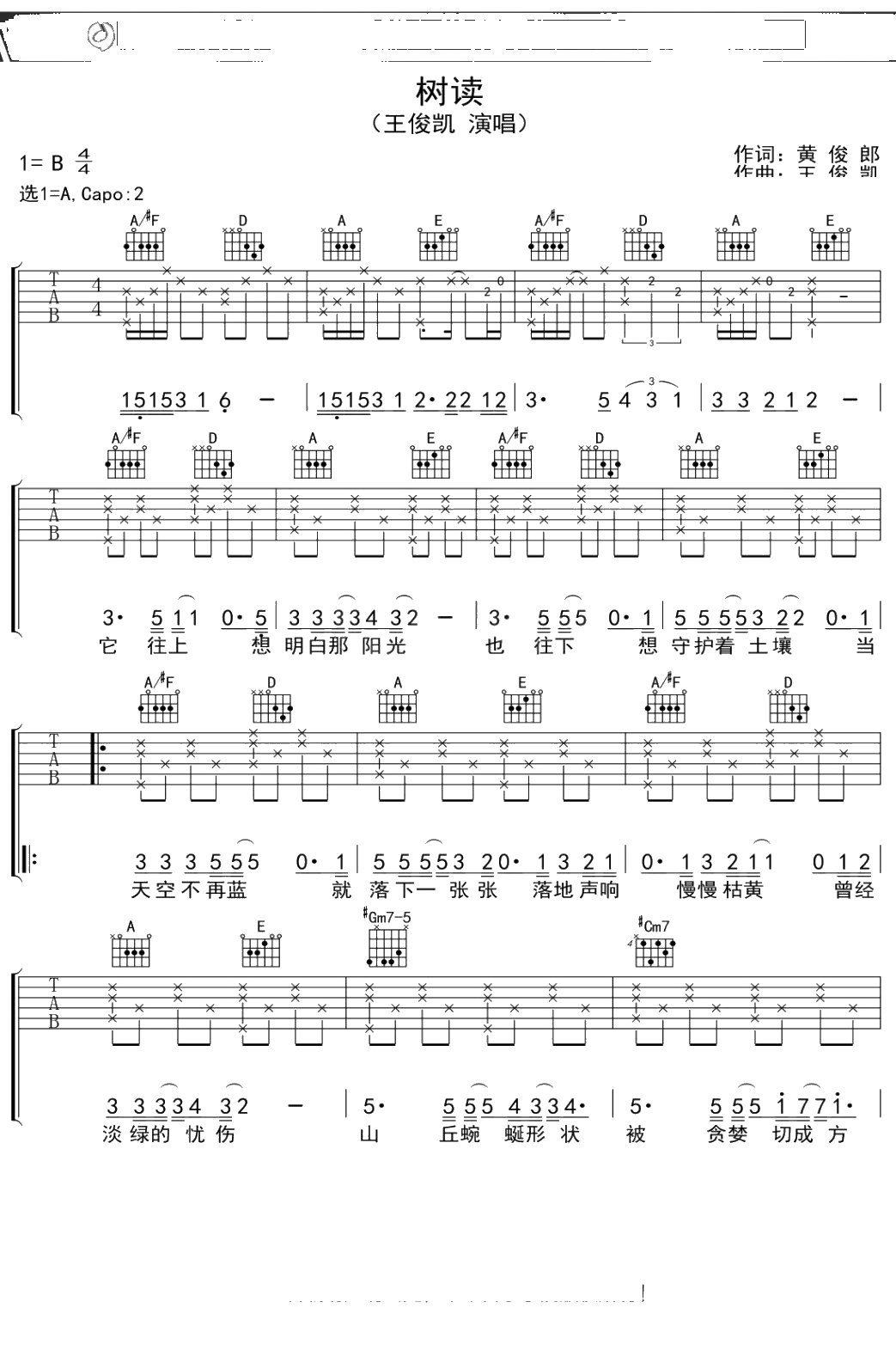 王俊凯《树读》吉他谱 A调弹唱六线谱