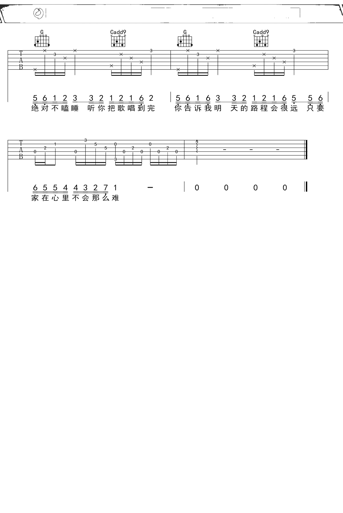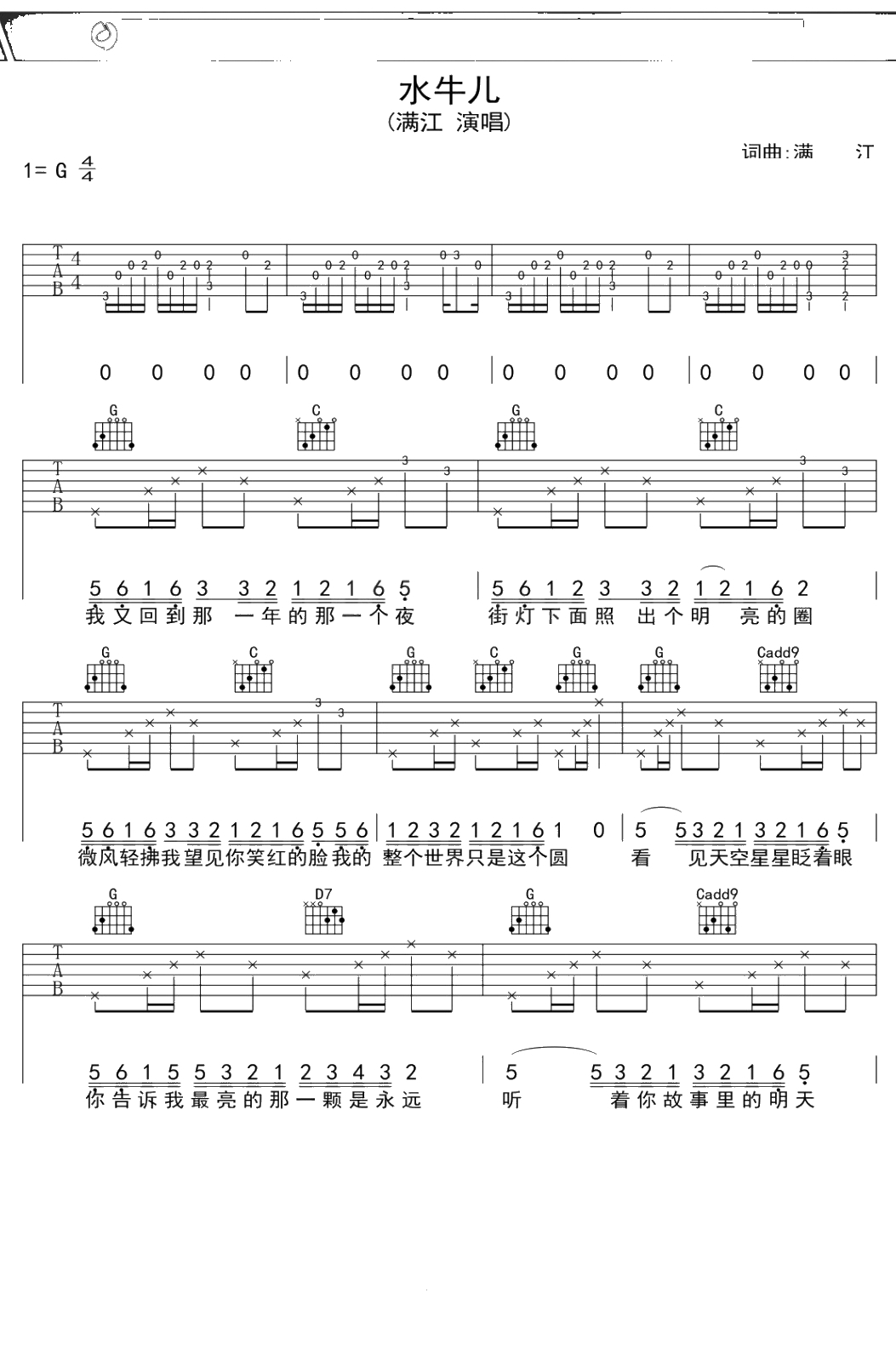 满江《水牛儿》吉他谱 G调弹唱六线谱