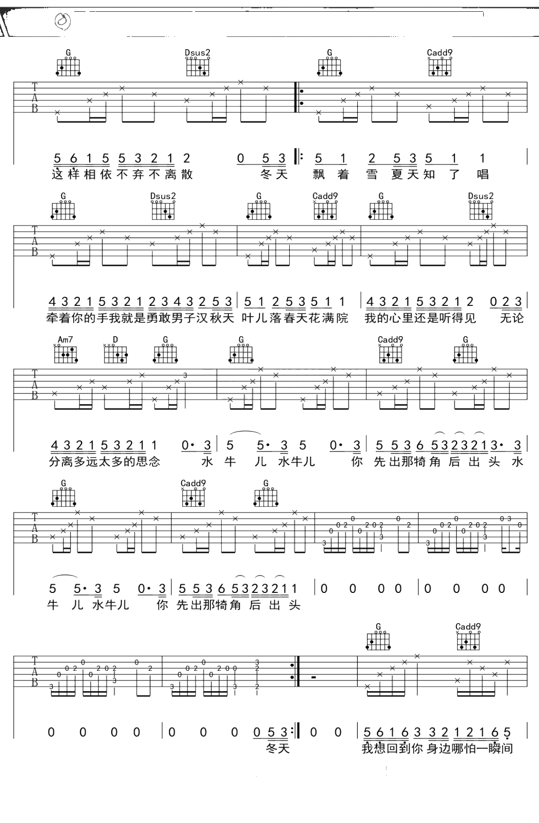 满江《水牛儿》吉他谱 G调弹唱六线谱吉他谱