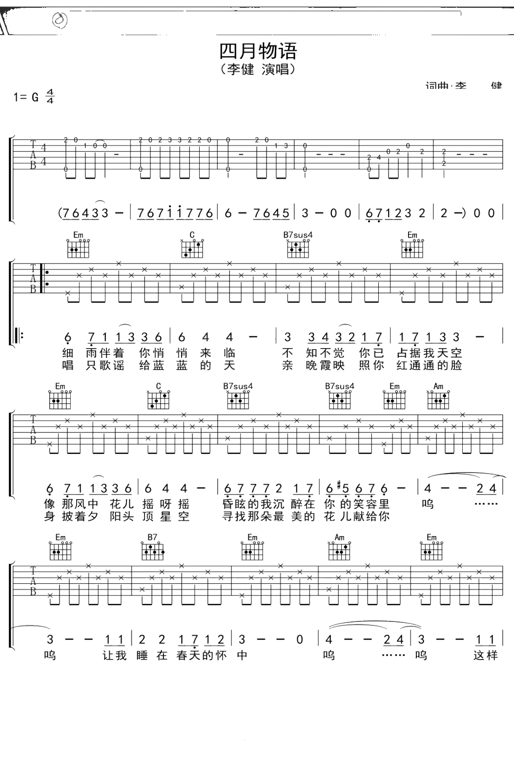 李健《四月物语》吉他谱 G调弹唱六线谱吉他谱