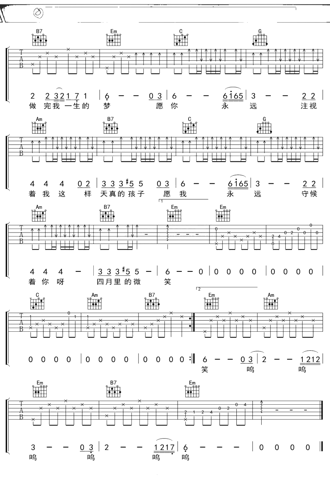 李健《四月物语》吉他谱 G调弹唱六线谱