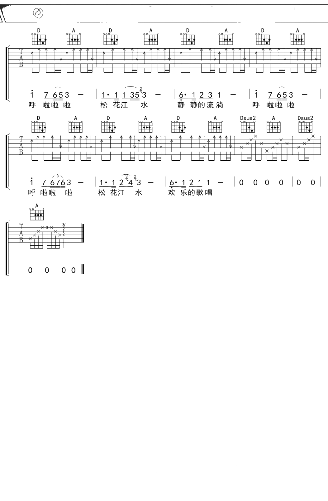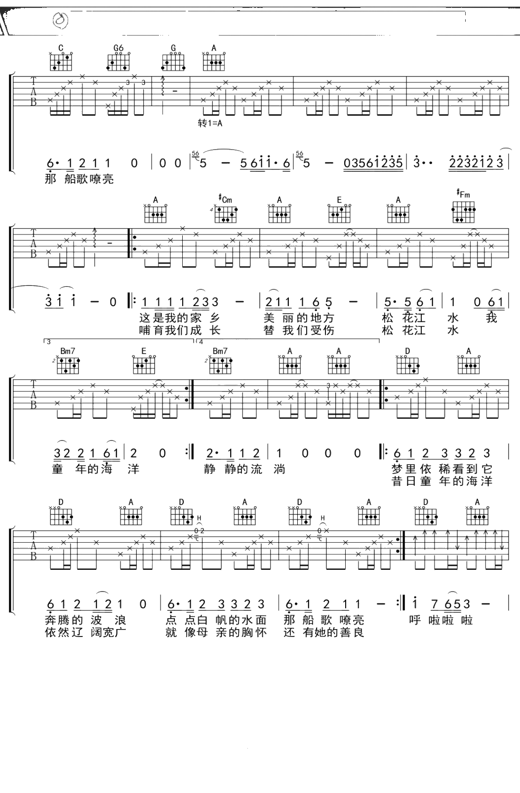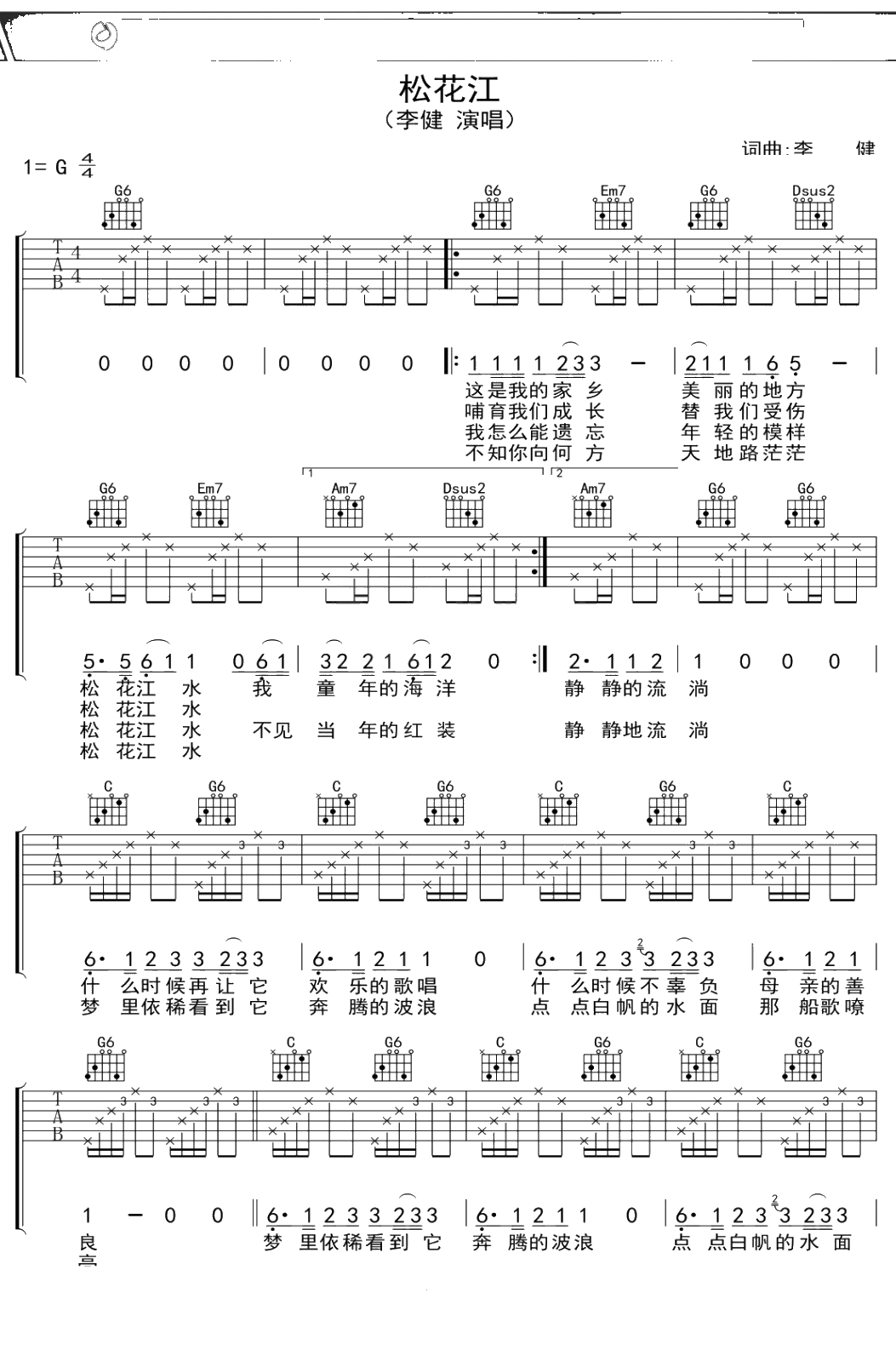 李健《松花江》吉他谱 G调弹唱六线谱