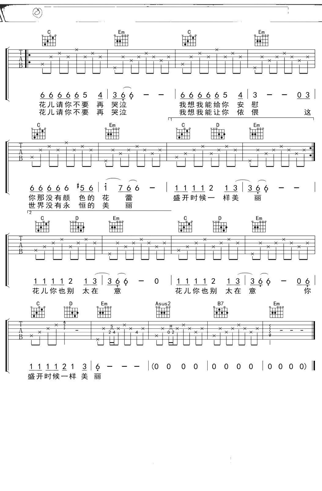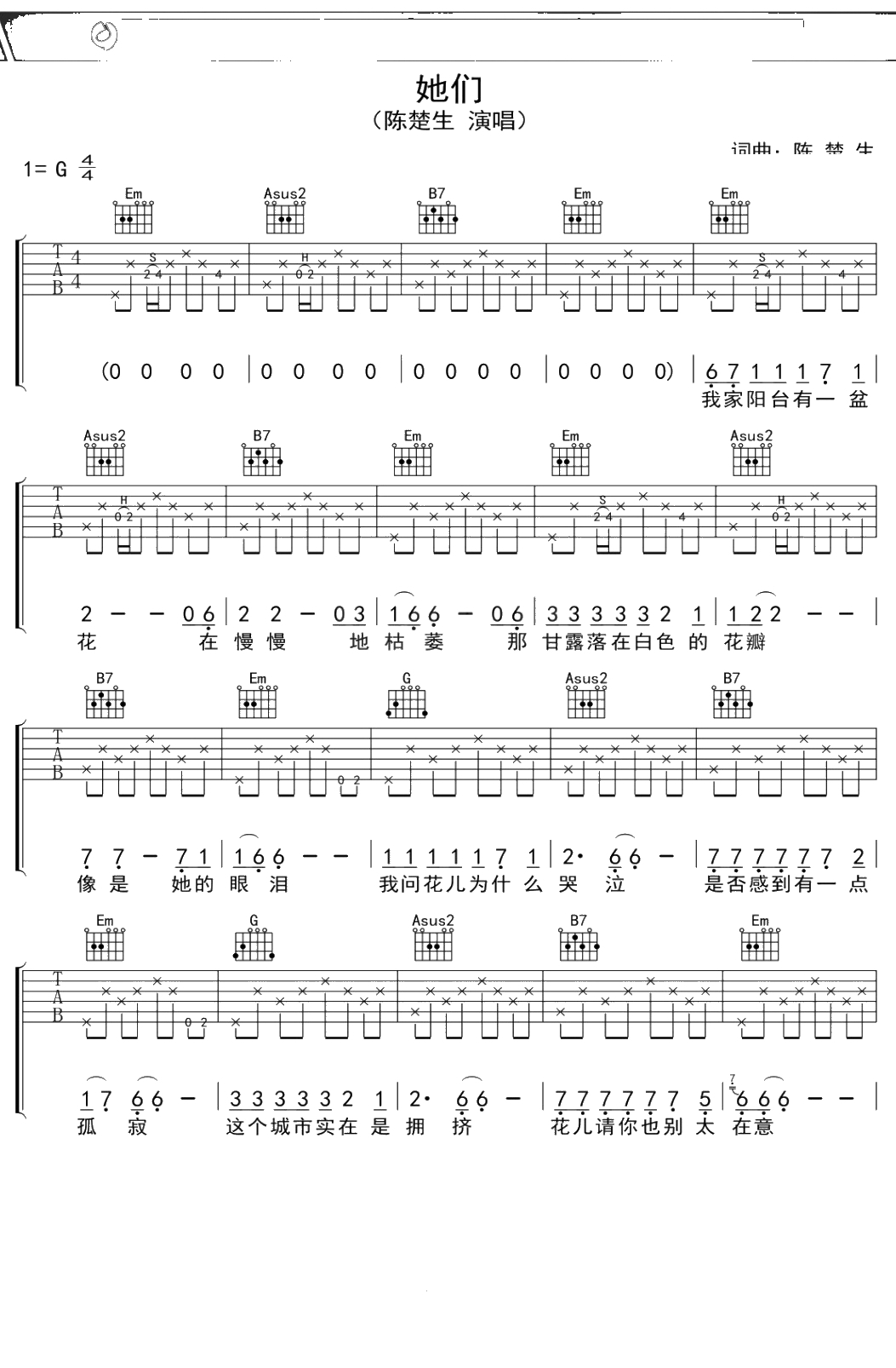 陈楚生《她们》吉他谱 弹唱六线谱