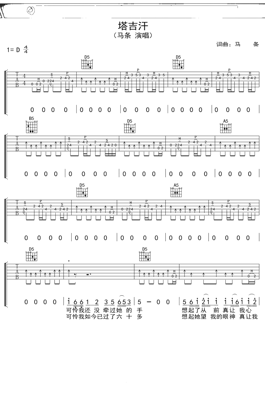 马条《塔吉汗》吉他谱 弹唱六线谱吉他谱