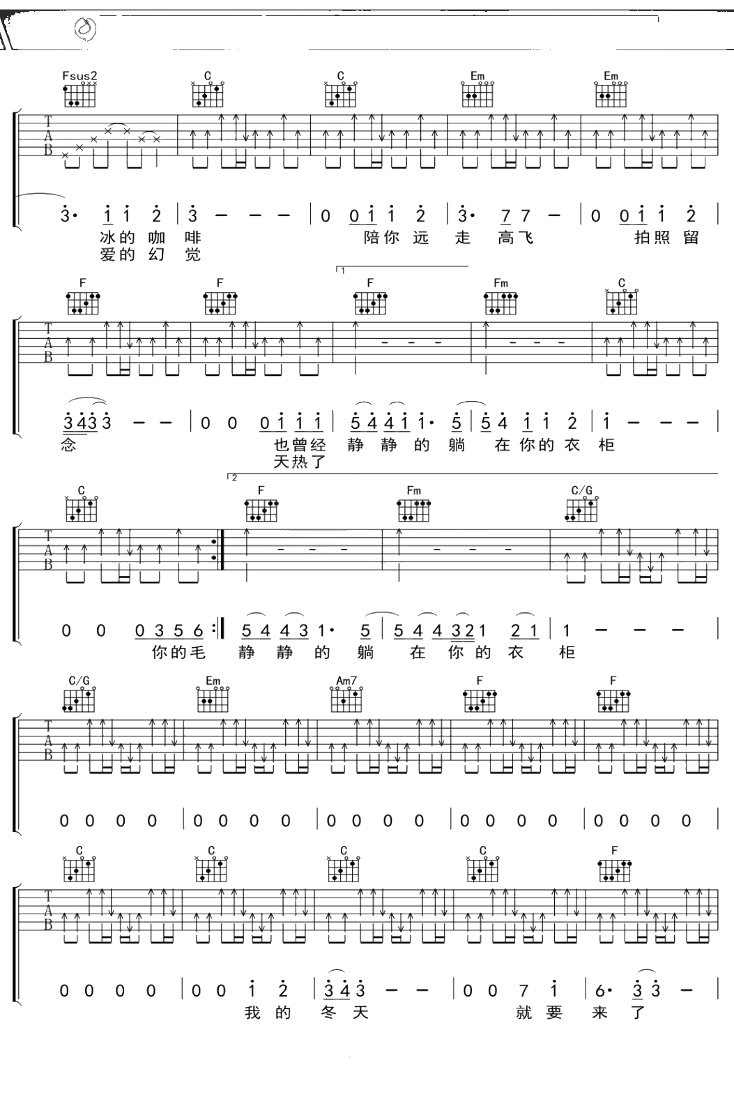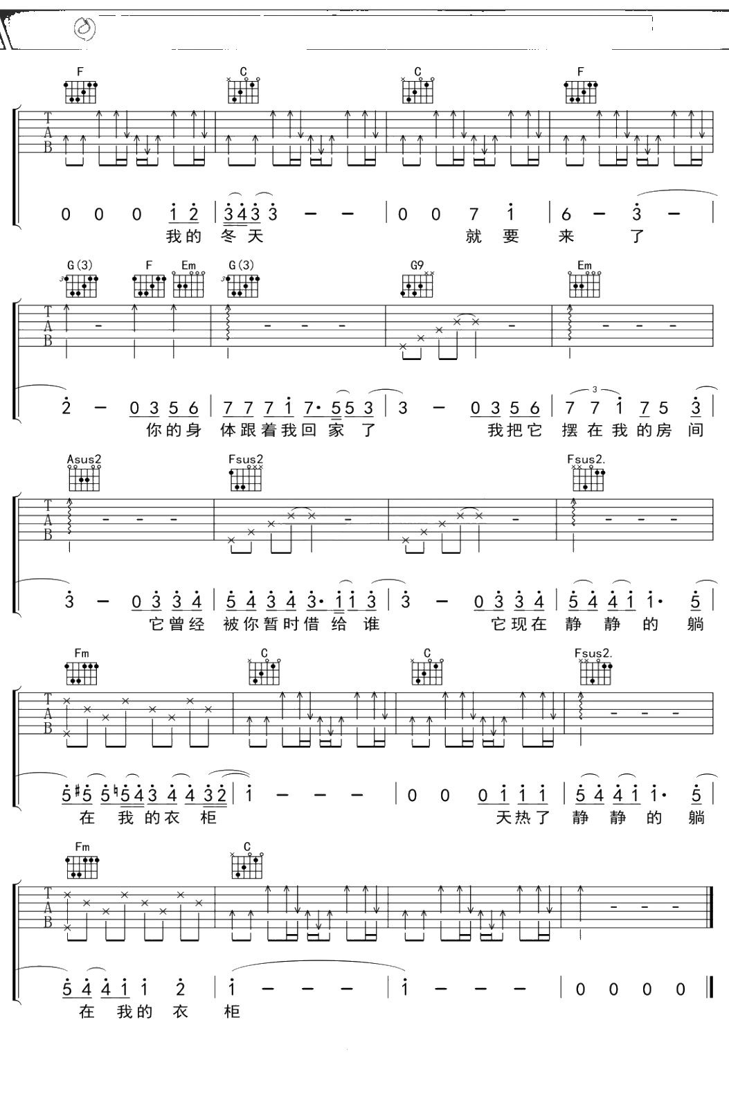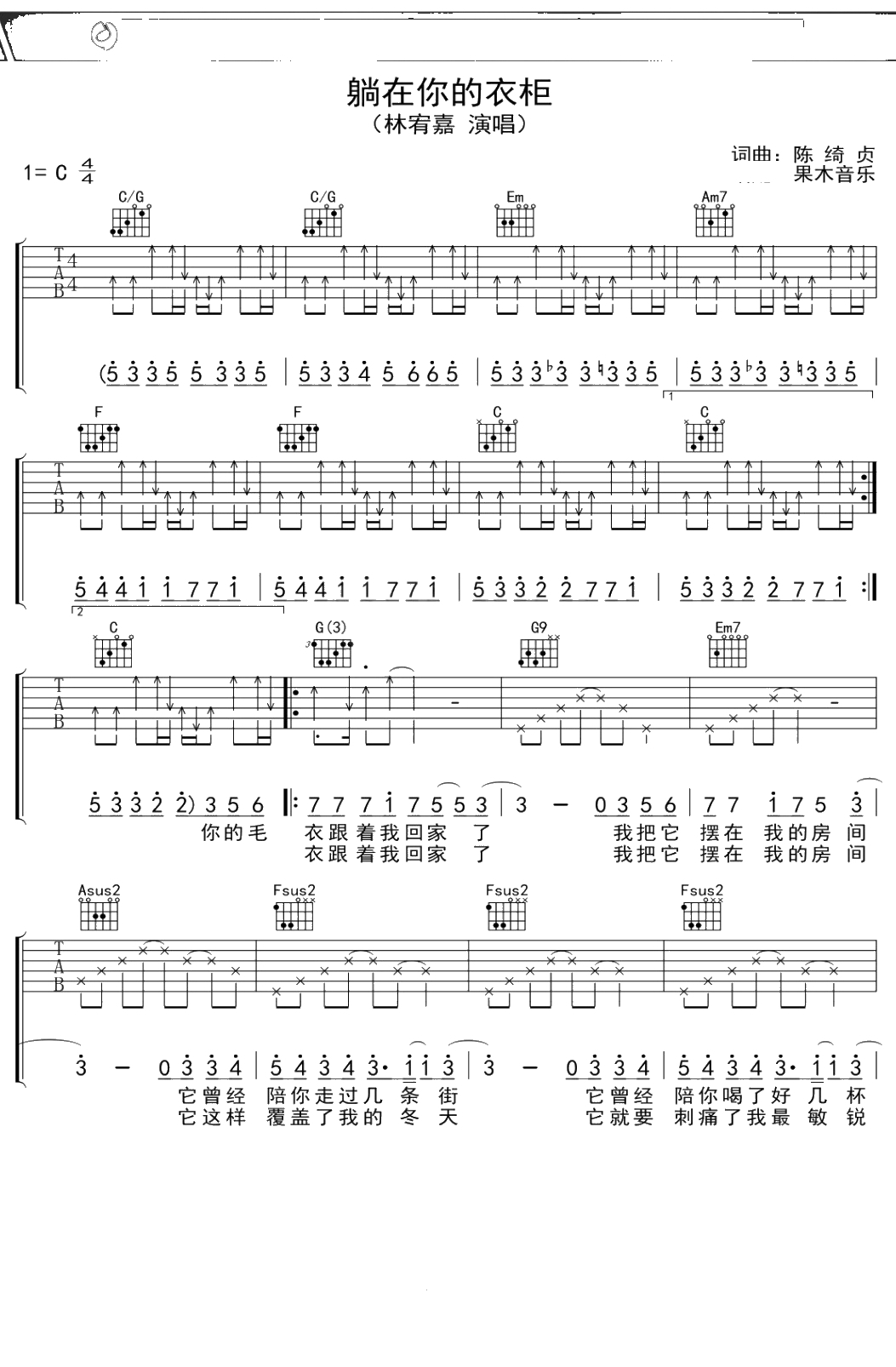 林宥嘉《躺在你的衣柜》吉他谱 C调弹唱六线谱吉他谱