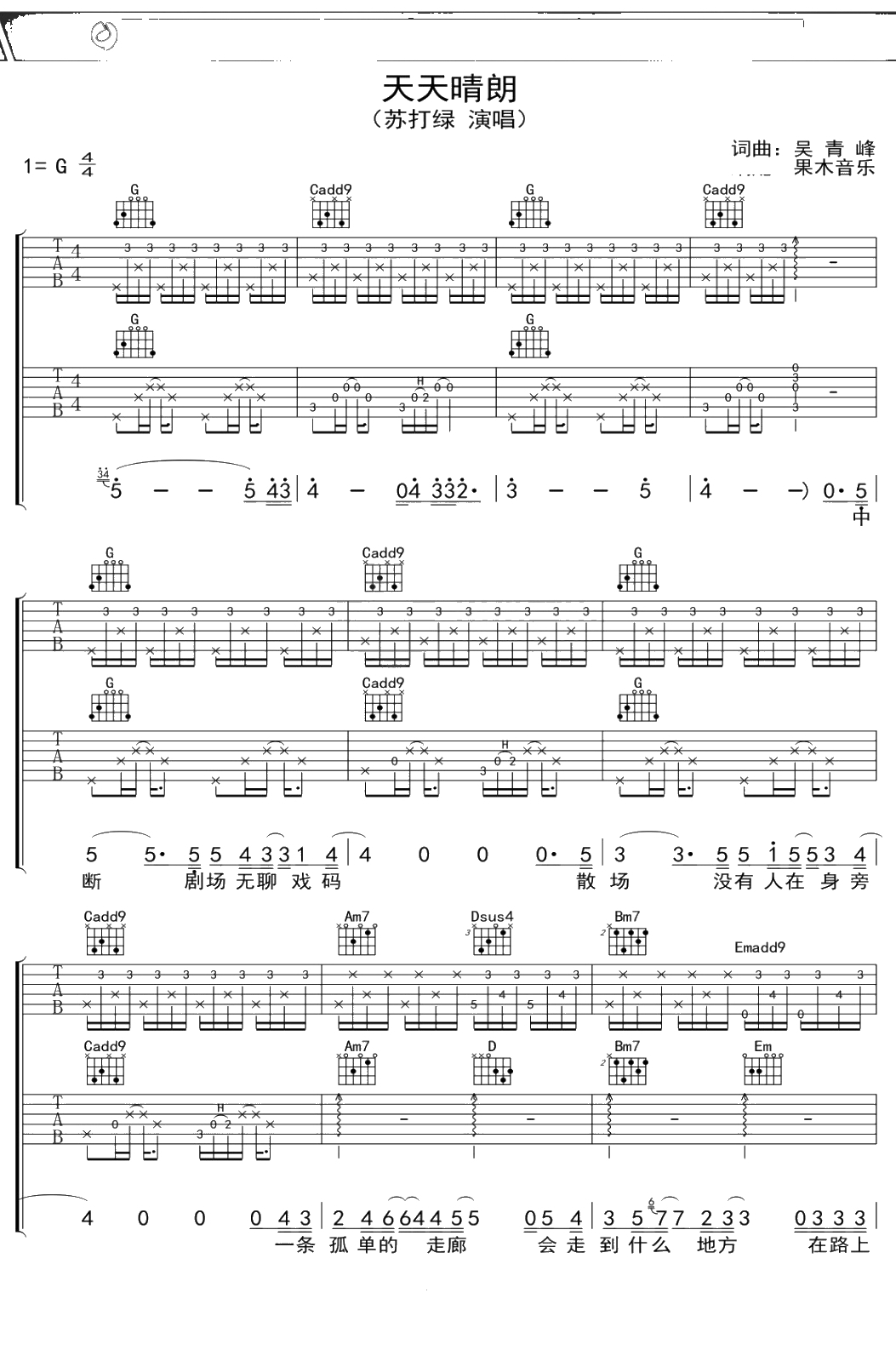 苏打绿《天天晴朗》吉他谱 G调弹唱六线谱吉他谱