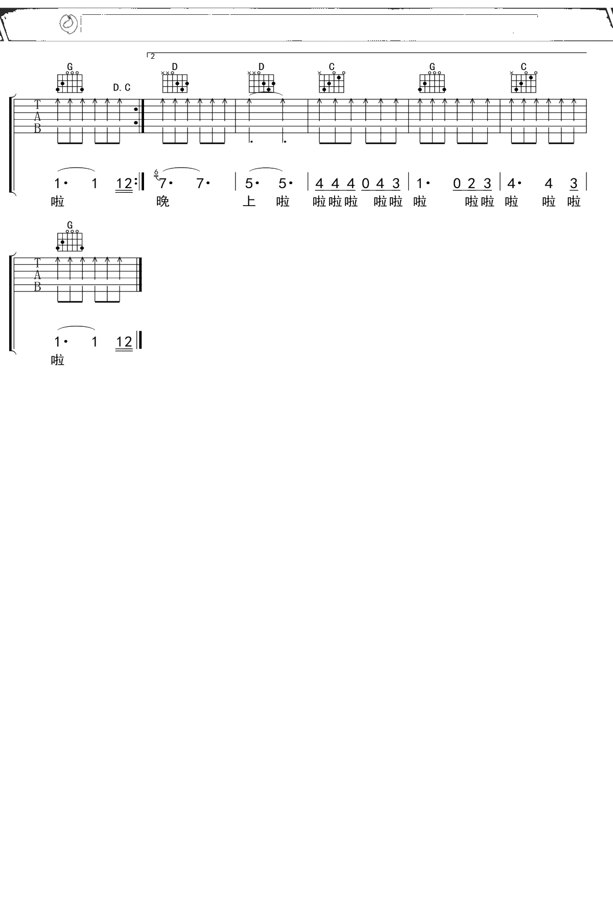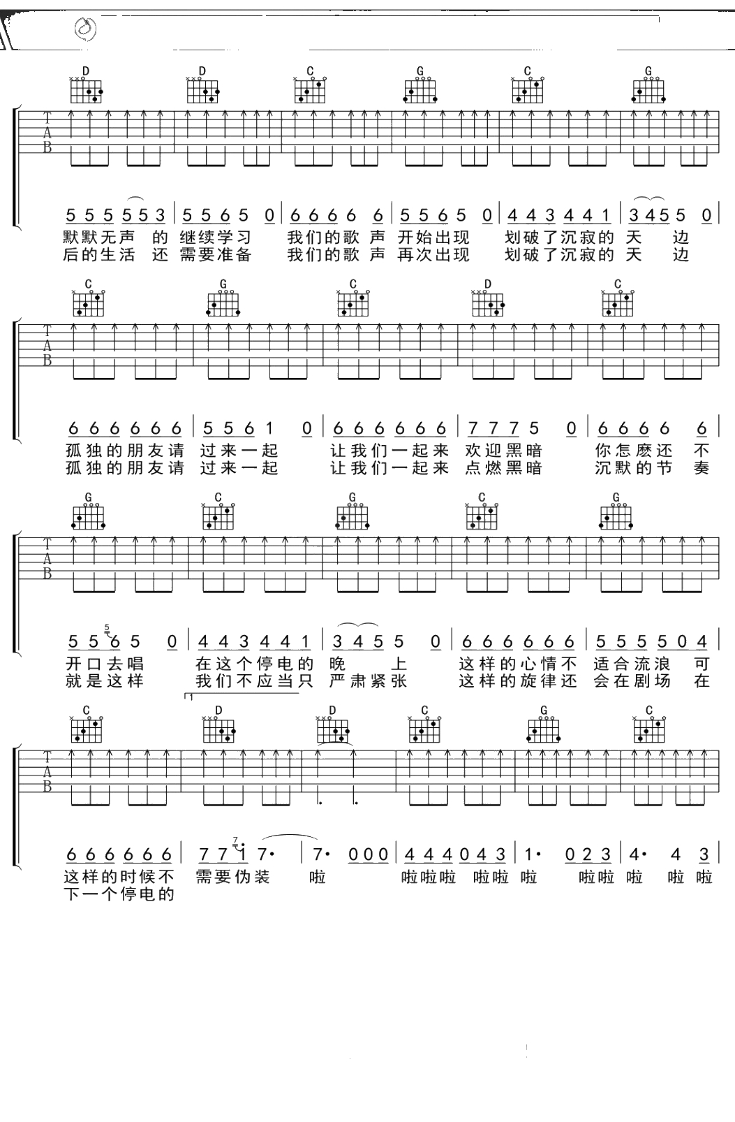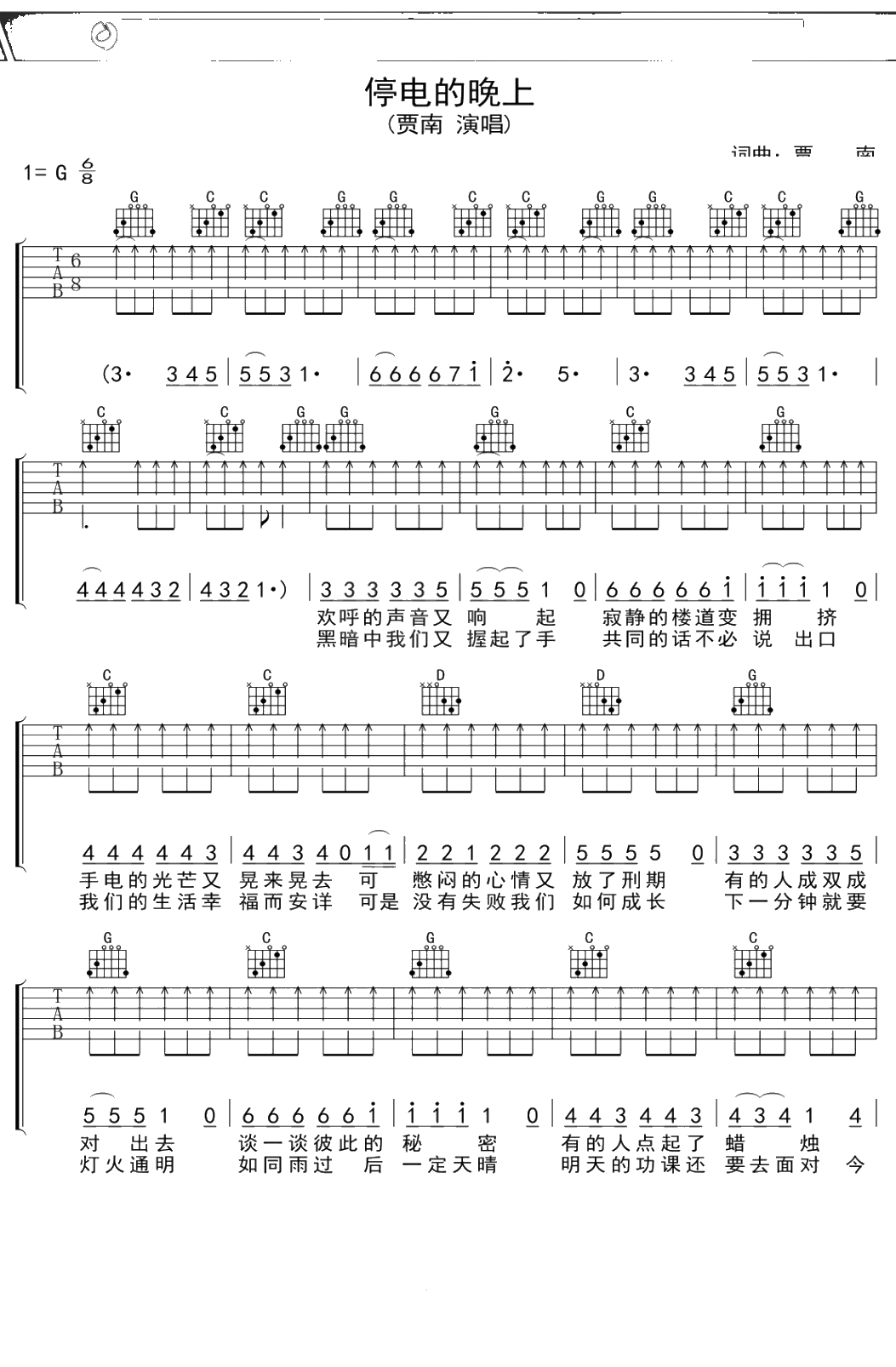 贾南《停电的晚上》吉他谱 G调弹唱六线谱
