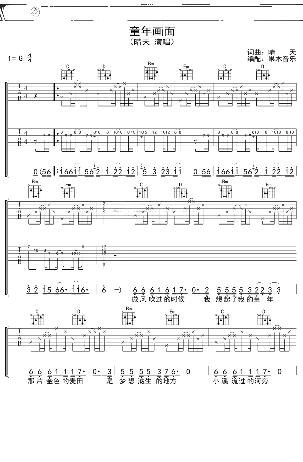晴天《童年画面》吉他谱 G调弹唱六线谱