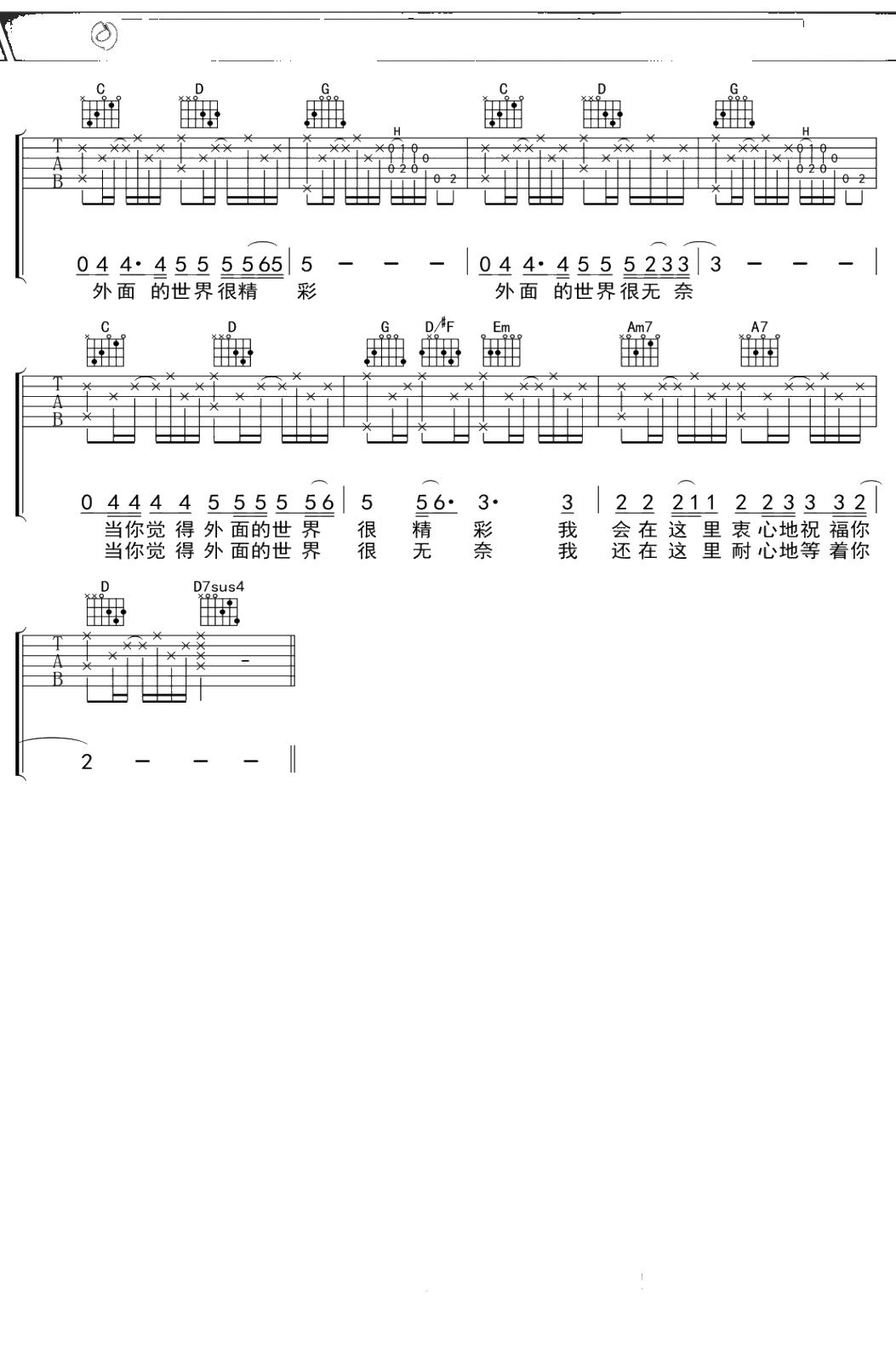 齐秦《外面的世界》吉他谱 G调弹唱六线谱