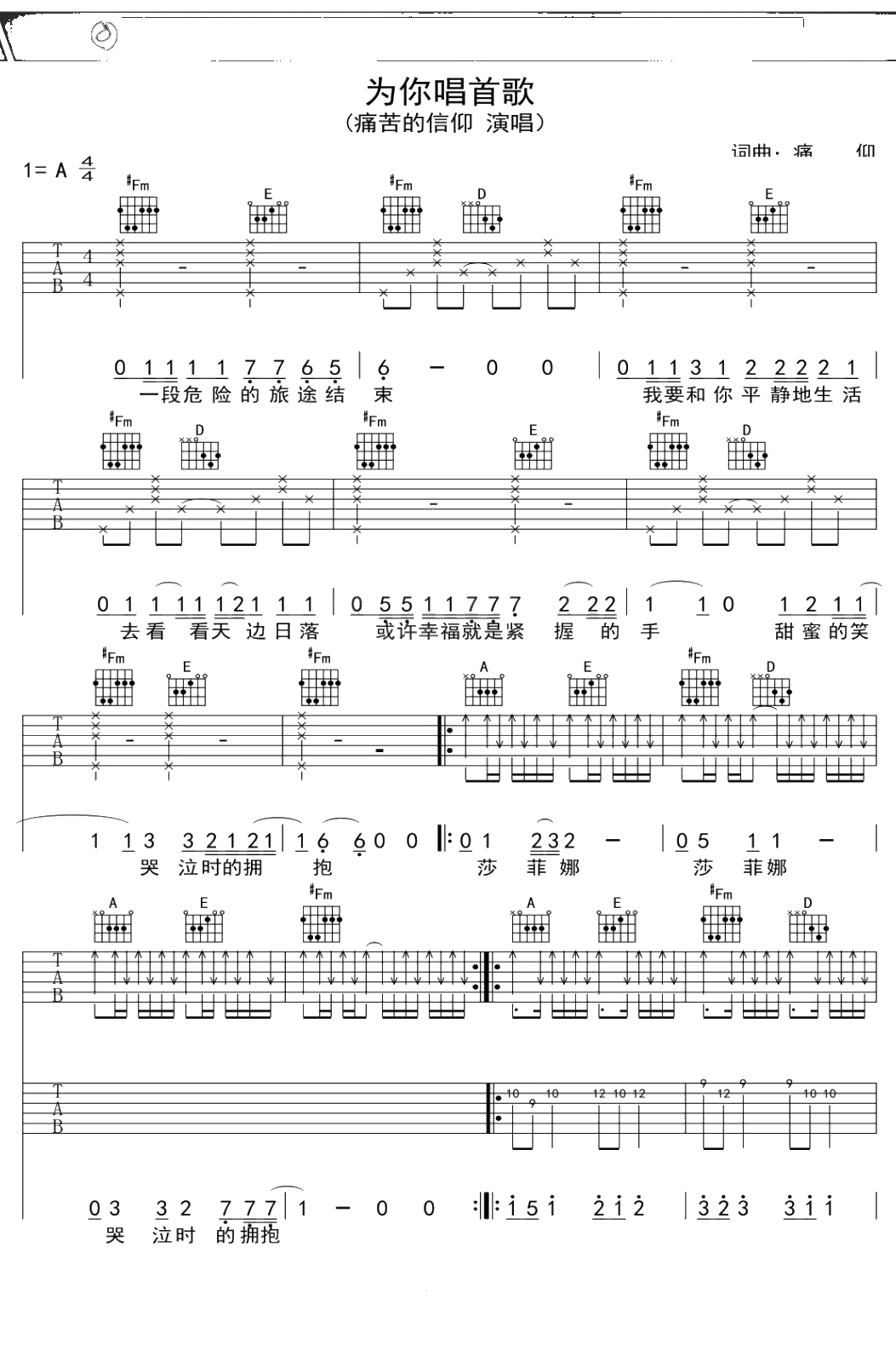 痛苦的信仰《为你唱首歌》吉他谱 A调弹唱六线谱
