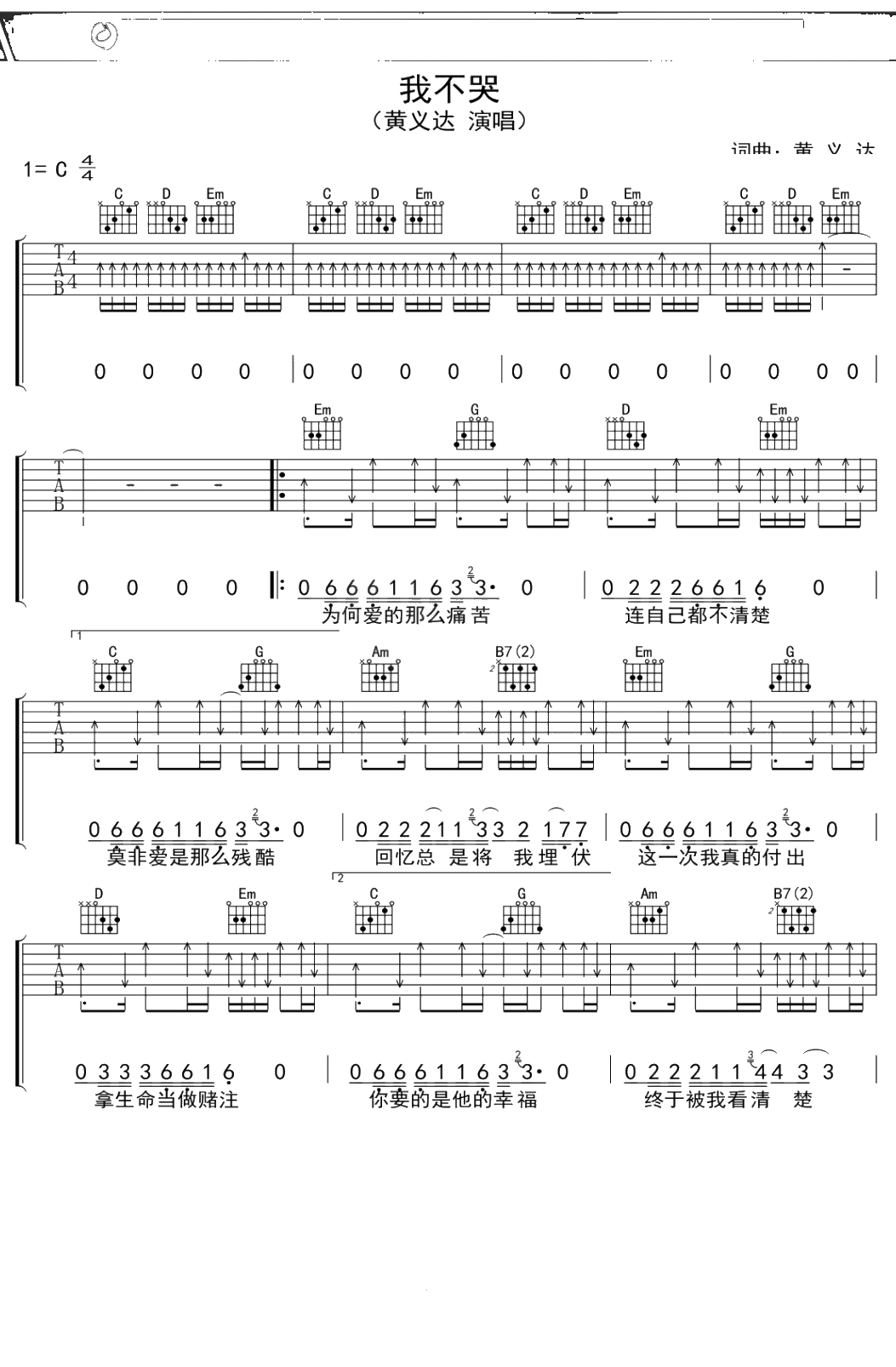 黄义达《我不哭》吉他谱 C调弹唱六线谱
